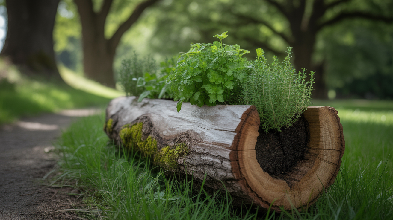 Use a naturally hollowed-out log (or hollow one yourself) as a rustic herb planter. Fill the inside with soil and plant a mix of herbs along the length of the log.