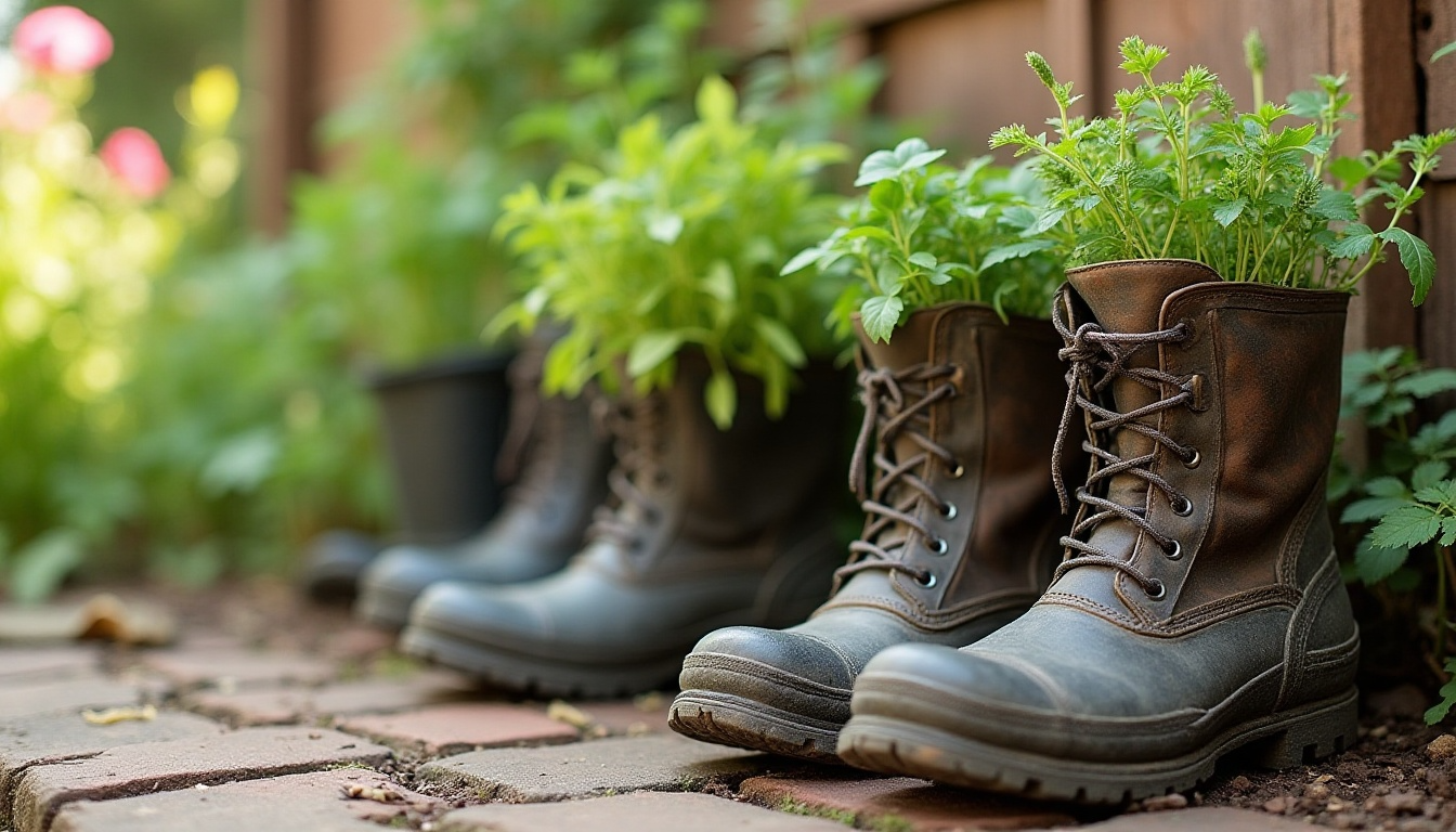 Give worn-out boots a new purpose as quirky herb planters with personality. Drill drainage holes in the soles, fill with quality potting mix, and plant compact herbs like thyme or chives.