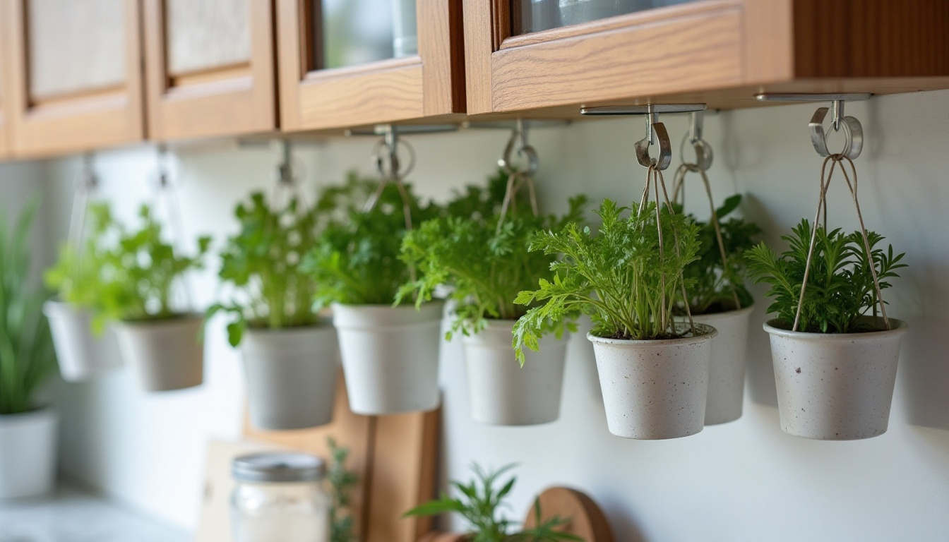 Maximize kitchen space by installing an under-cabinet herb rack. These space-saving solutions keep herbs within easy reach while cooking. Choose lightweight containers that won’t strain your cabinets and herbs that thrive in partial light conditions.