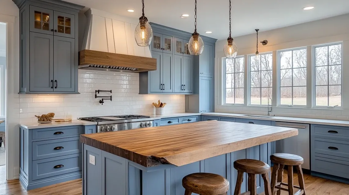 Soft blue cabinets with butcher block countertops create a warm, welcoming space perfect for family meals and casual hangouts. The natural wood of the butcher block brings warmth and texture, while the soft blue feels clean and calming.