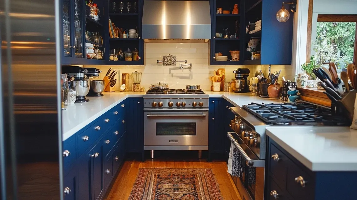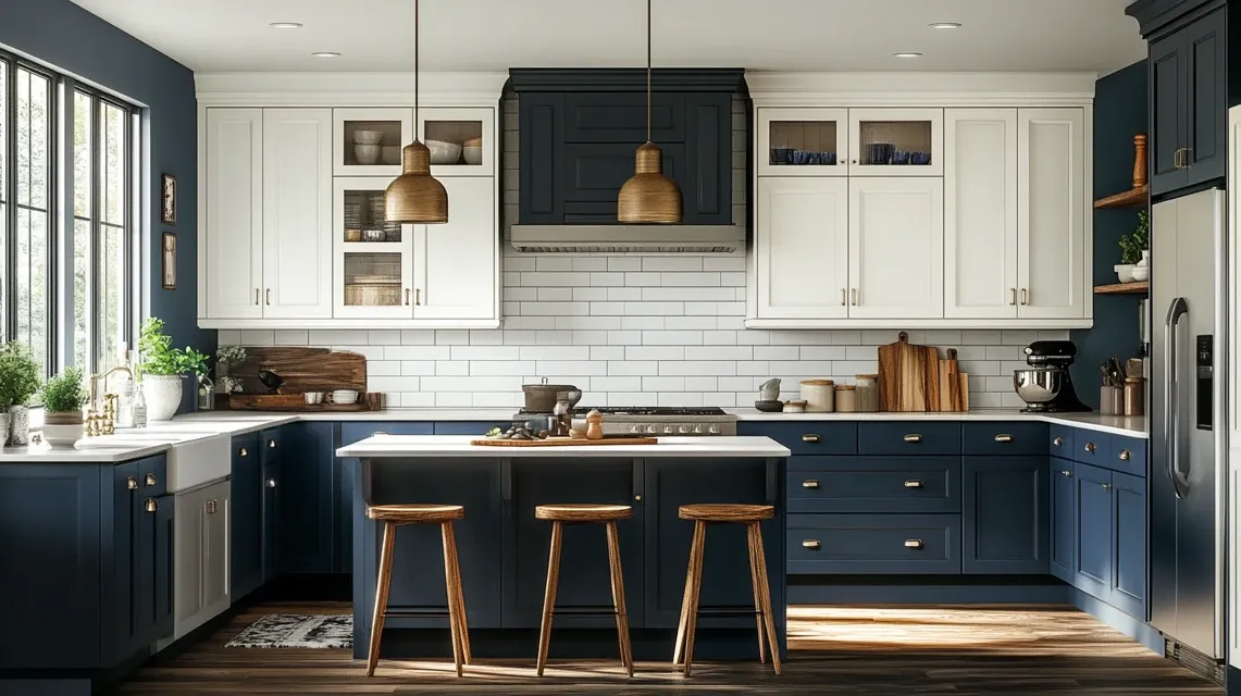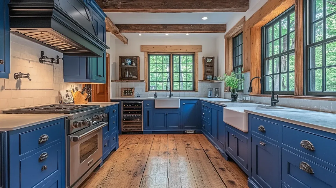 This mix is great for people who want a kitchen that feels welcoming but not too fancy. It’s a fun twist on a classic blue kitchen.
