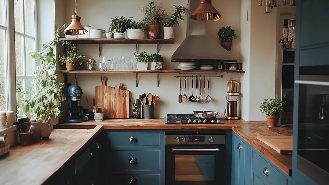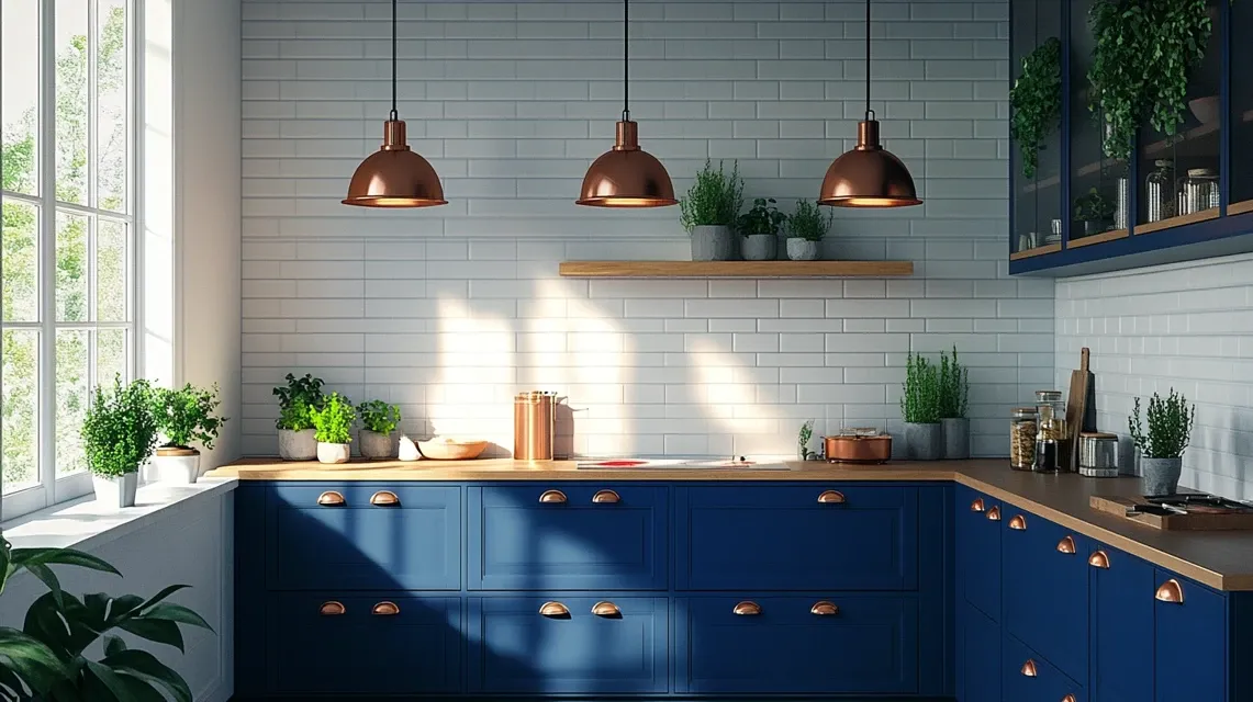 Bright blue cabinets are full of energy and life. Adding copper accents like lights, handles, or faucets brings warmth and sparkle to the space. The bright, metallic shine of copper balances the boldness of bright blue, making the kitchen feel exciting but still cozy.