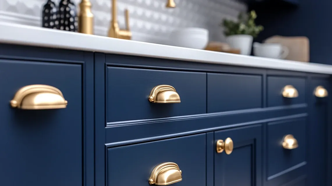Deep blue cabinets paired with brass hardware create a rich, high-end look. The deep color of the cabinets feels strong and steady, while the warm shine of brass brings in a little luxury.