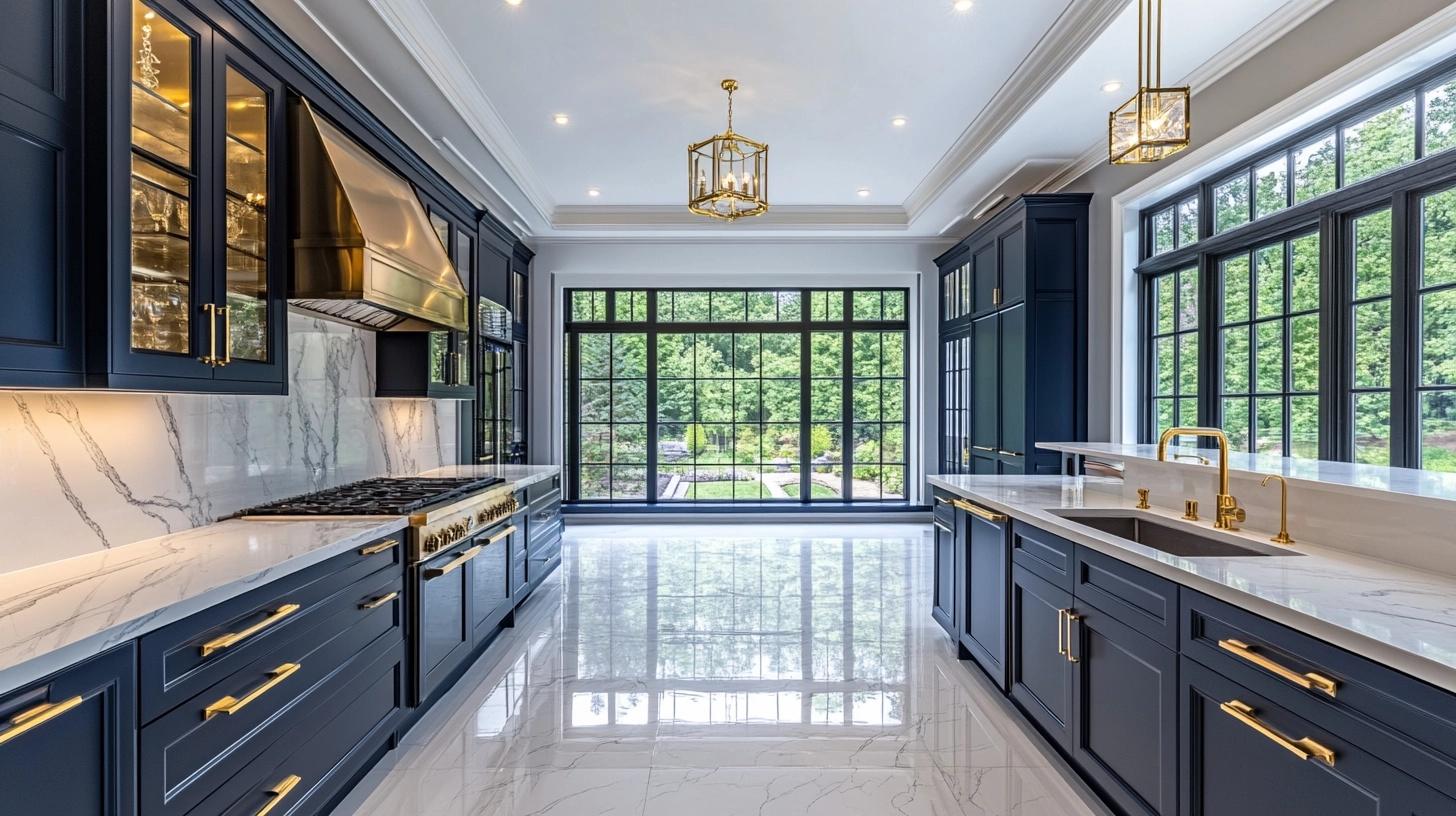 Navy blue cabinets and white marble countertops are a timeless pair. The deep blue brings depth and richness, while the bright marble lifts the whole space, keeping it from feeling heavy. The white veins in the marble add gentle movement and texture.