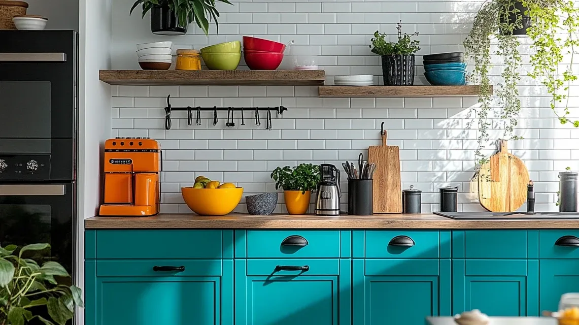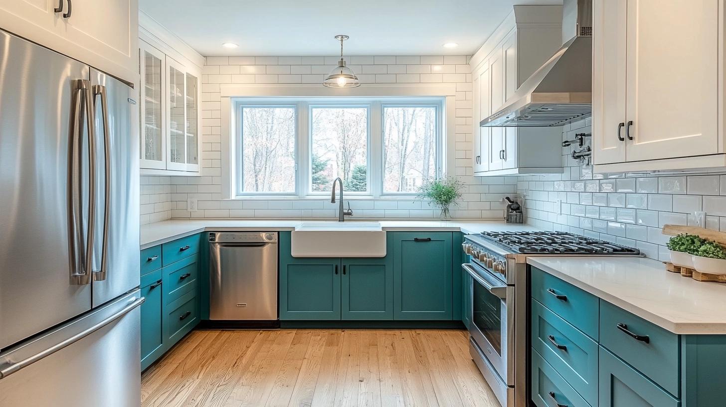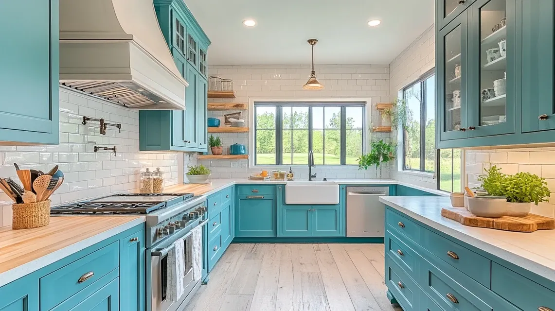 Teal cabinets bring bold color and life into a kitchen. When you pair them with a simple white subway tile backsplash, it keeps the space feeling neat and balanced. The white tiles offer a clean background that lets the teal really shine.