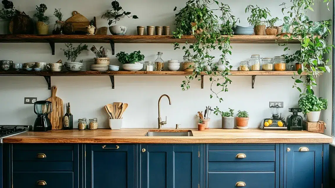 Cobalt blue cabinets bring boldness to the kitchen. Pairing them with warm wooden open shelving softens the look and adds a cozy, natural touch.