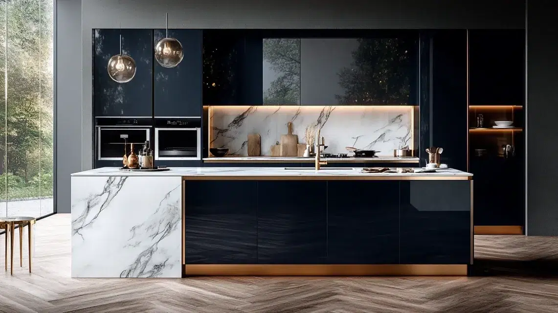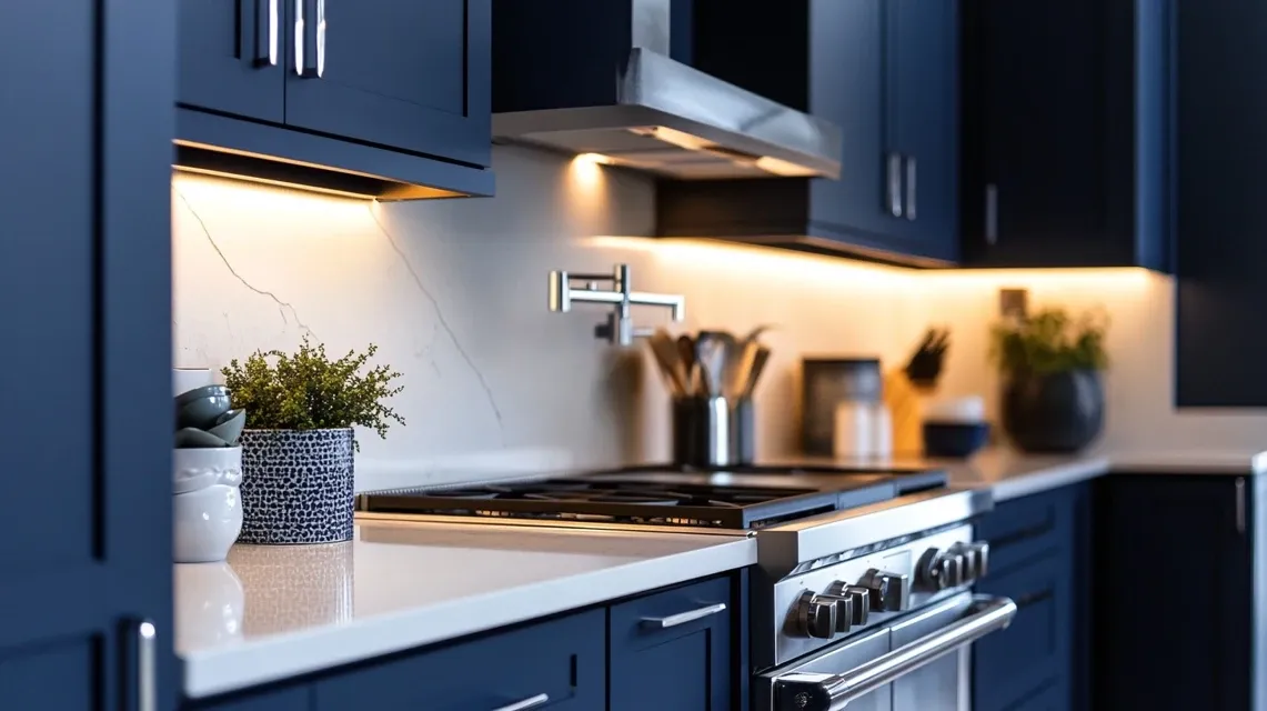 Navy blue cabinets paired with white quartz countertops create a sharp and clean look. The deep blue brings strength, while the bright white quartz offers a polished, fancy finish. This combo looks great in both modern and classic kitchens, and it helps bounce light around the room.