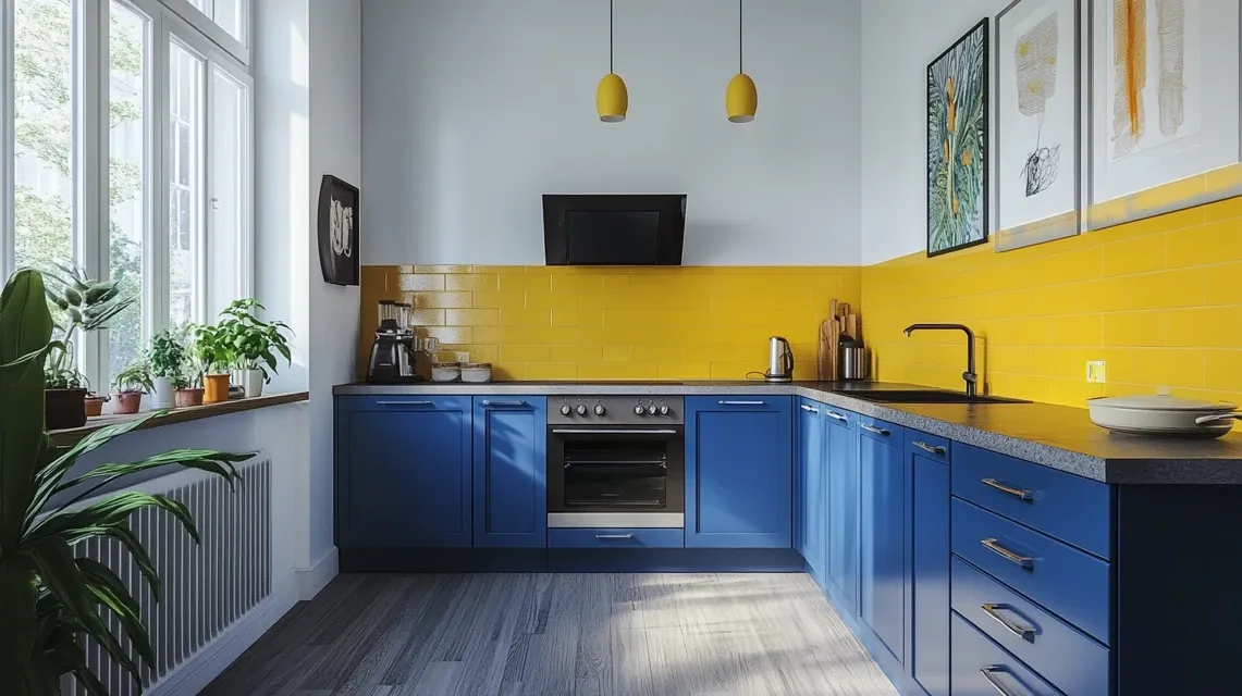 Electric blue cabinets bring big energy into the kitchen. Adding bright yellow accents like backsplash tiles, light fixtures, or dishes creates a playful, happy space.