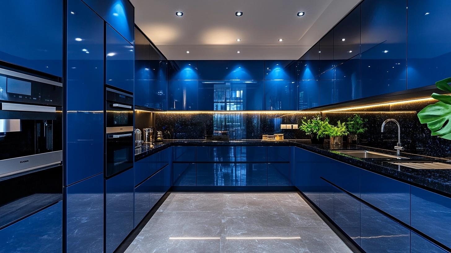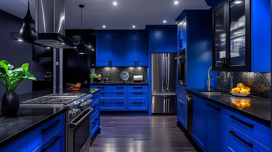 Royal blue cabinets paired with black countertops make a bold and powerful kitchen. The deep colors create a strong look without being too much when you add good lighting and some metallic touches like silver or brass.