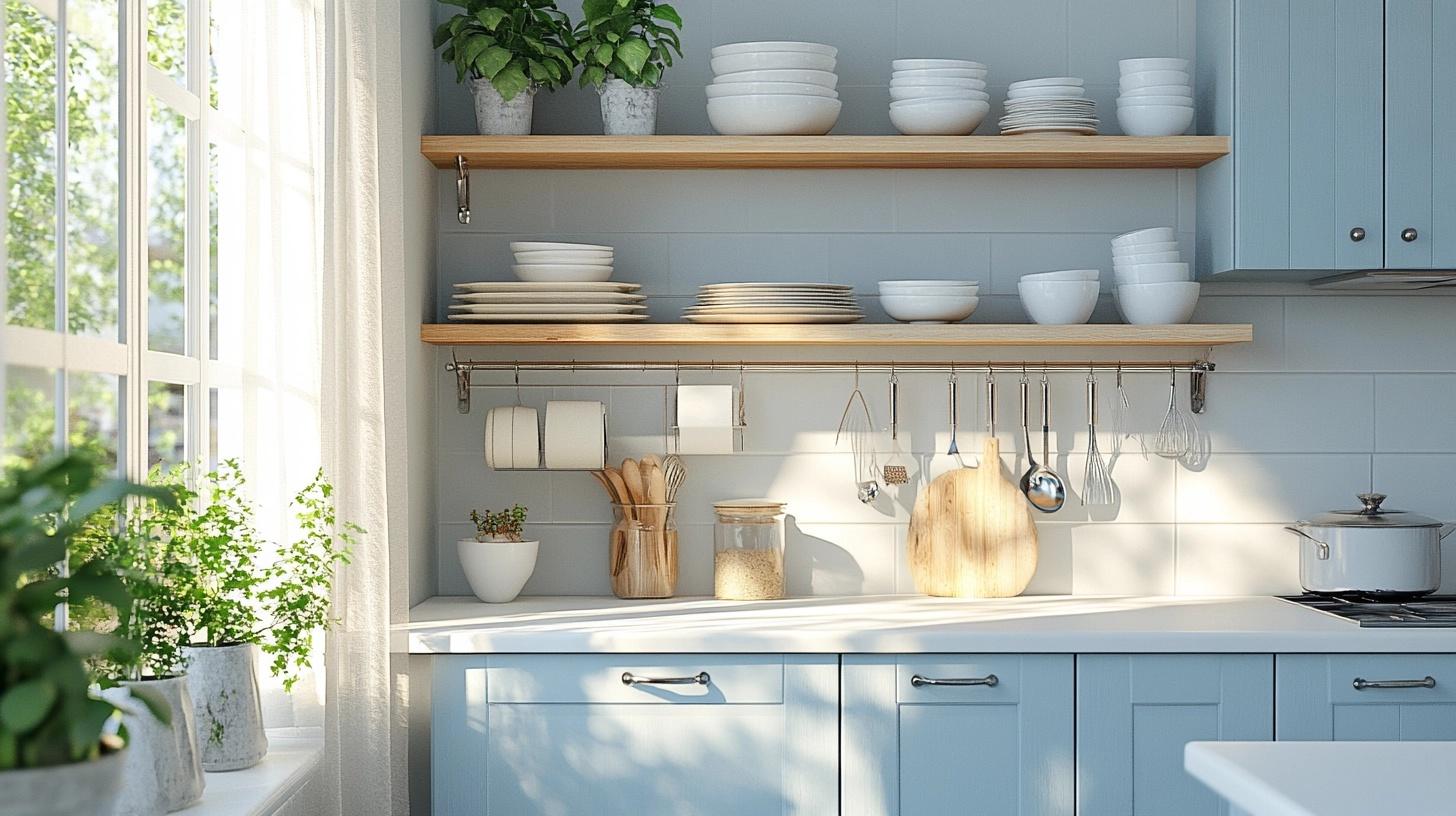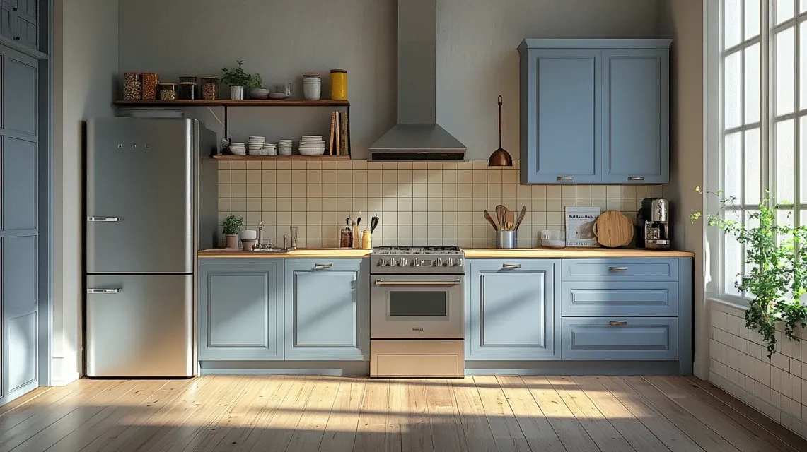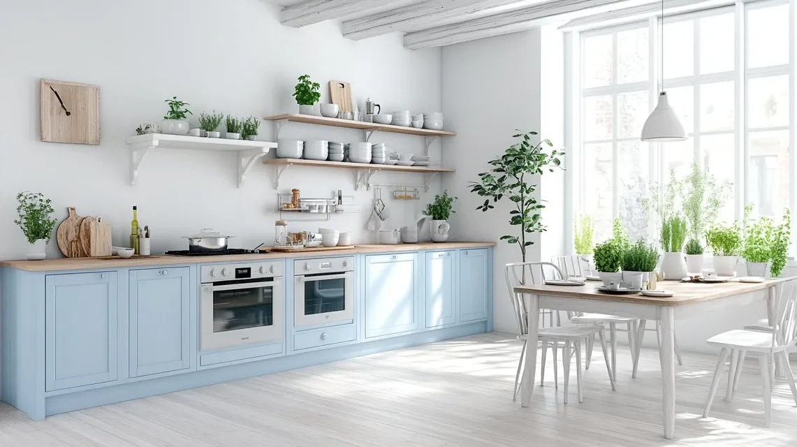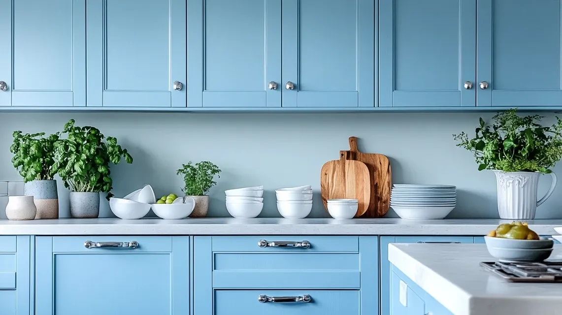 Pale blue fits best in country-style kitchens, coastal looks, and even simple modern homes. It pairs nicely with white countertops, light wood shelves, and silver or chrome hardware.