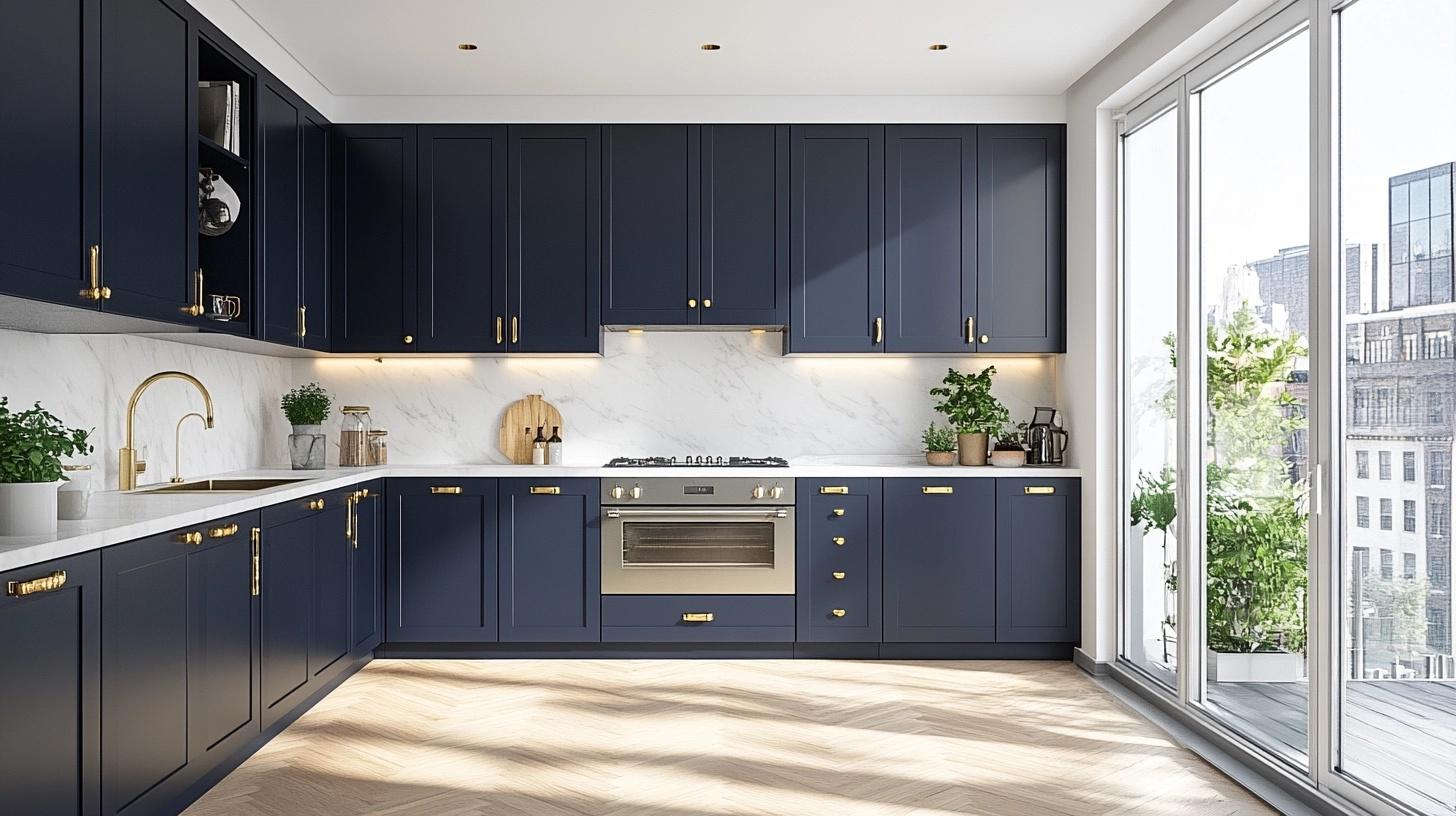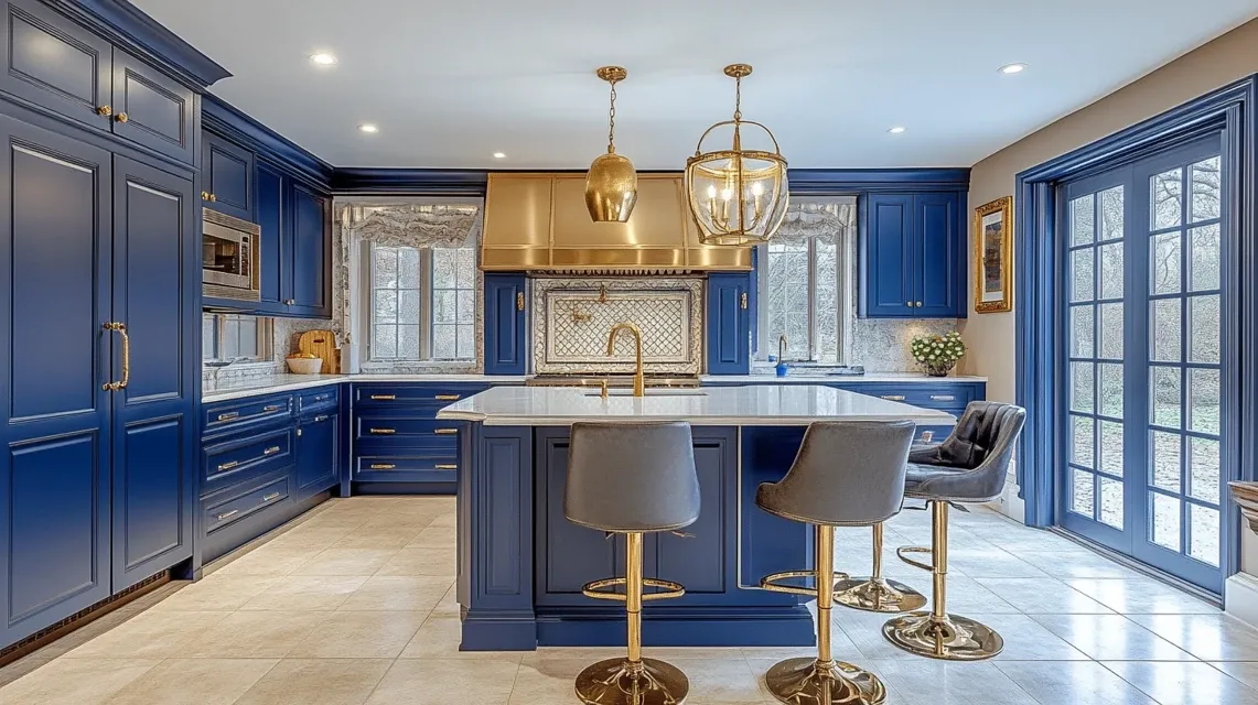 Midnight blue cabinets paired with gold accents create a rich, fancy look. The dark blue brings depth and strength, while the gold handles, faucets, or backsplash tiles add a warm shine. This pairing feels cozy and polished without being too flashy.