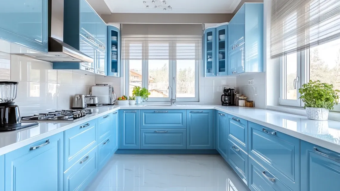 Ice blue cabinets feel fresh, cool, and peaceful. Pairing them with glossy white countertops gives the kitchen a clean, modern look.