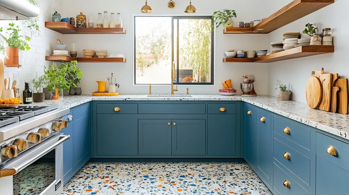 Steel blue cabinets feel strong and steady. Mixing them with colorful terrazzo flooring adds a playful, stylish touch.