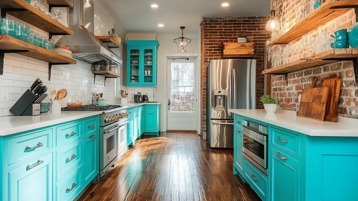 Turquoise cabinets bring a bright, happy feeling to any kitchen. Pairing them with dark wood floors creates a bold but balanced space. The dark floors help ground the brightness of turquoise, making the kitchen feel exciting but not overwhelming.