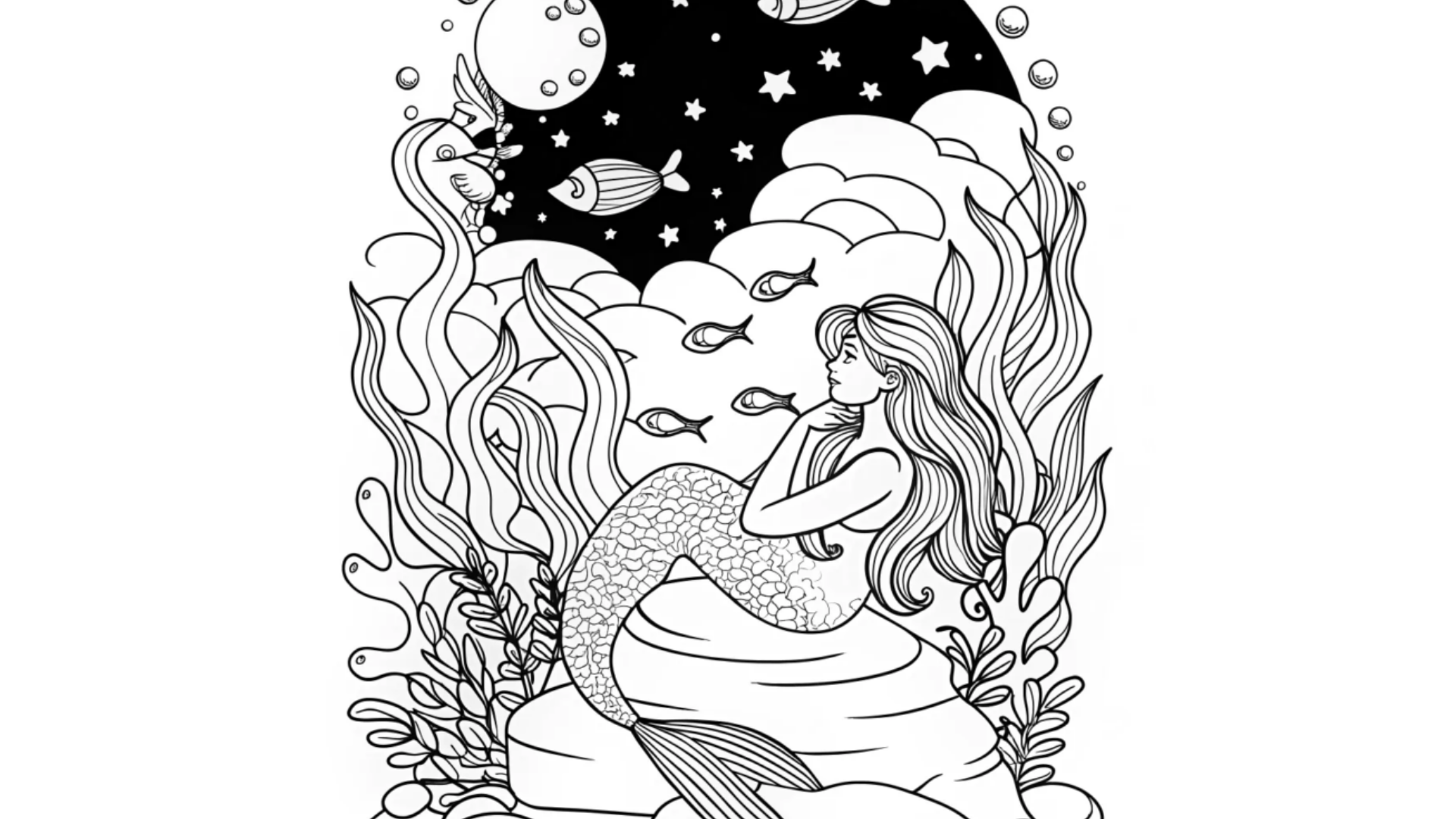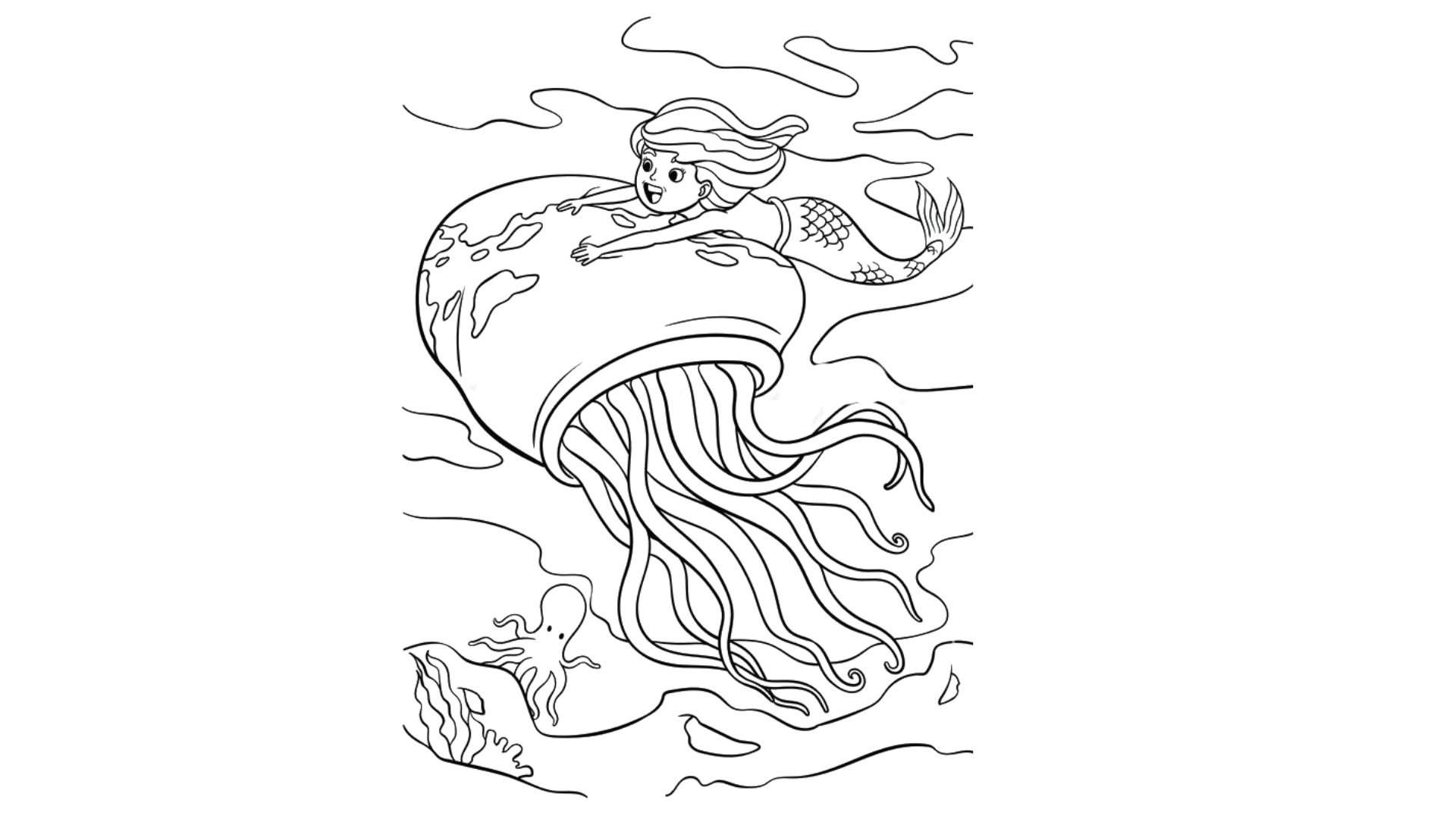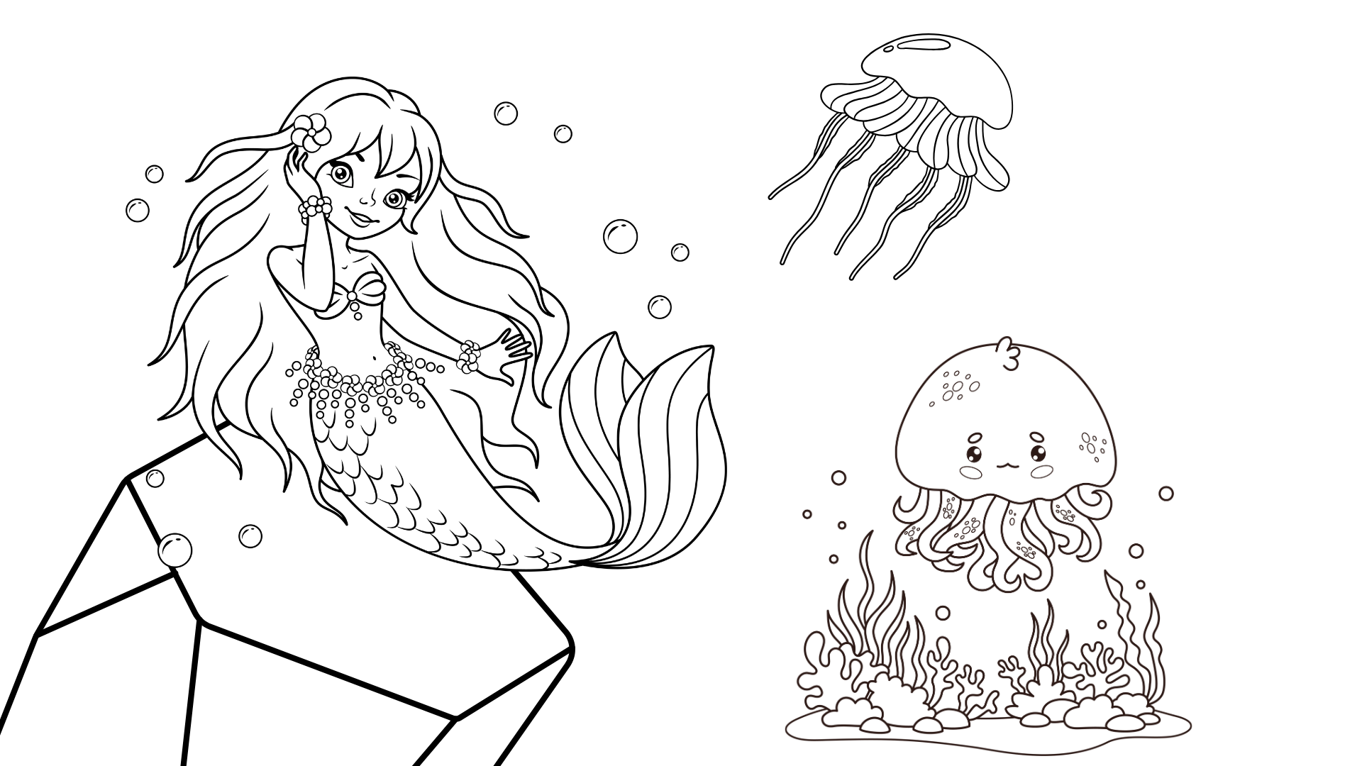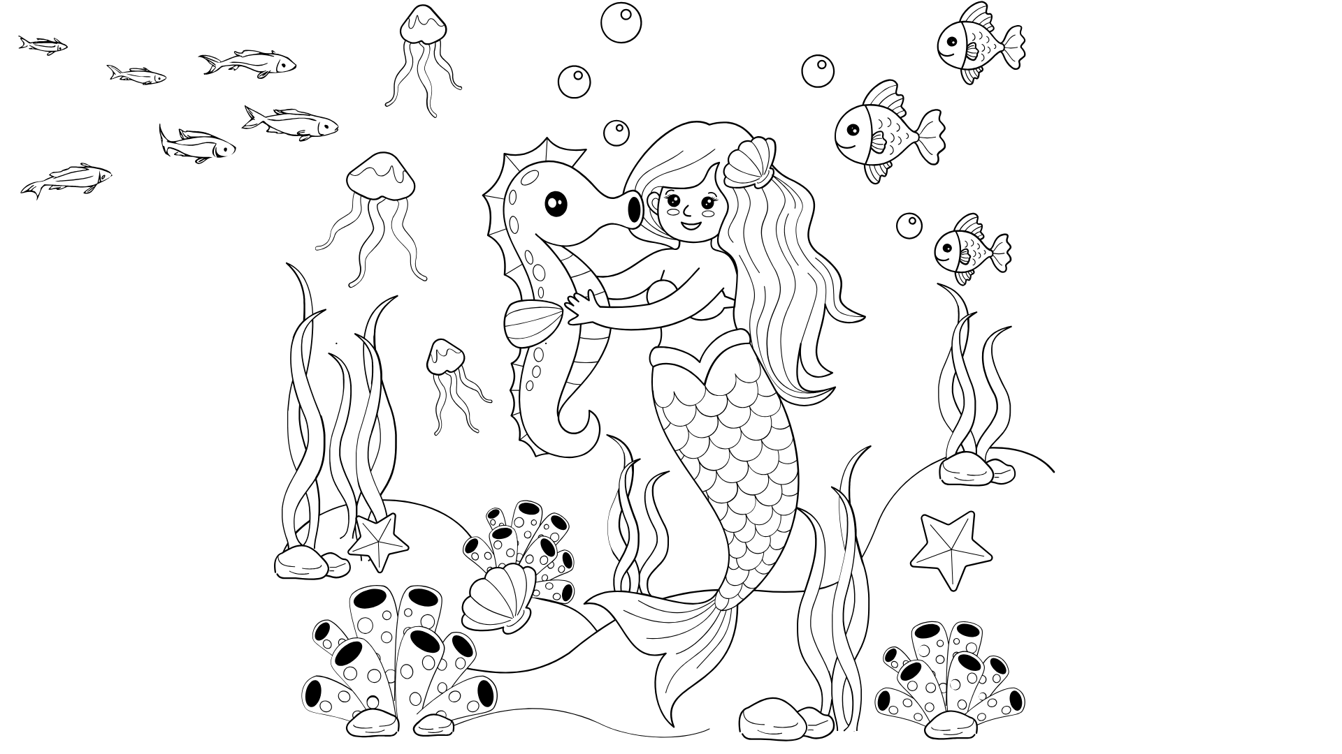 This scene offers a more artistic take on the mermaid. The outline style gives creative kids the freedom to add their own patterns and colors.