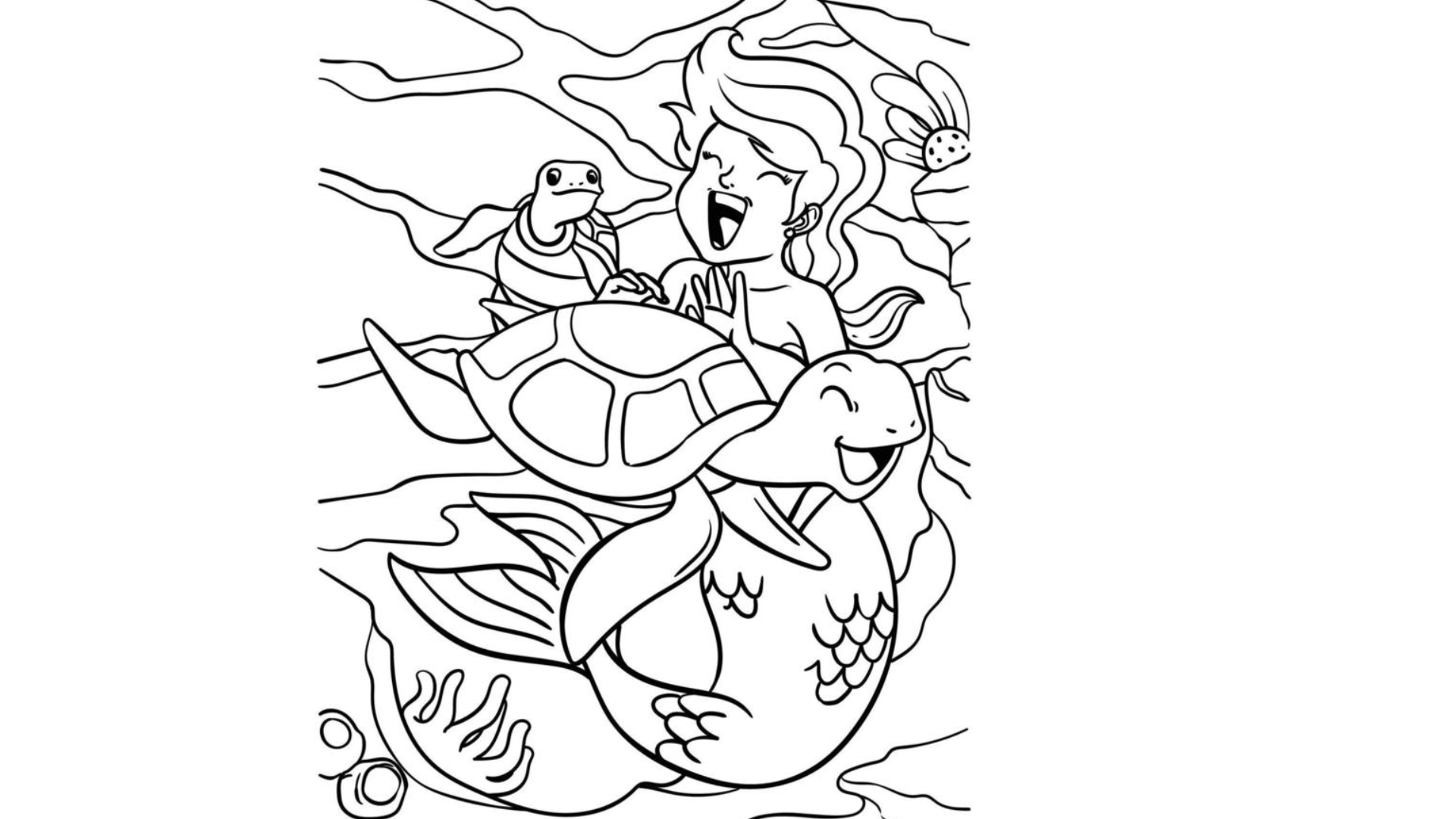 This page pairs our mermaid with a giant, friendly turtle. The spaces are big enough for young artists to fill.