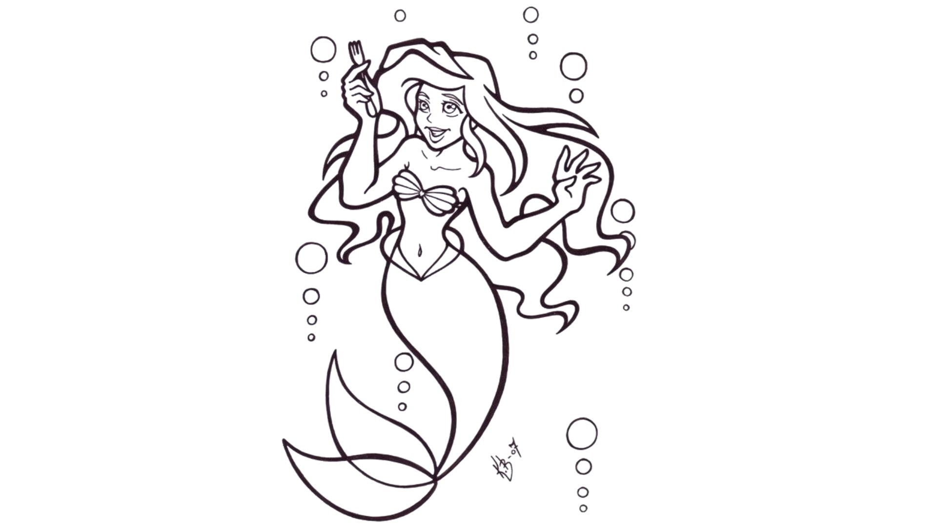 Focuses just on Ariel’s beautiful tail with fancy scales and swirls. This page is perfect for older kids who enjoy adding lots of colors and shading.