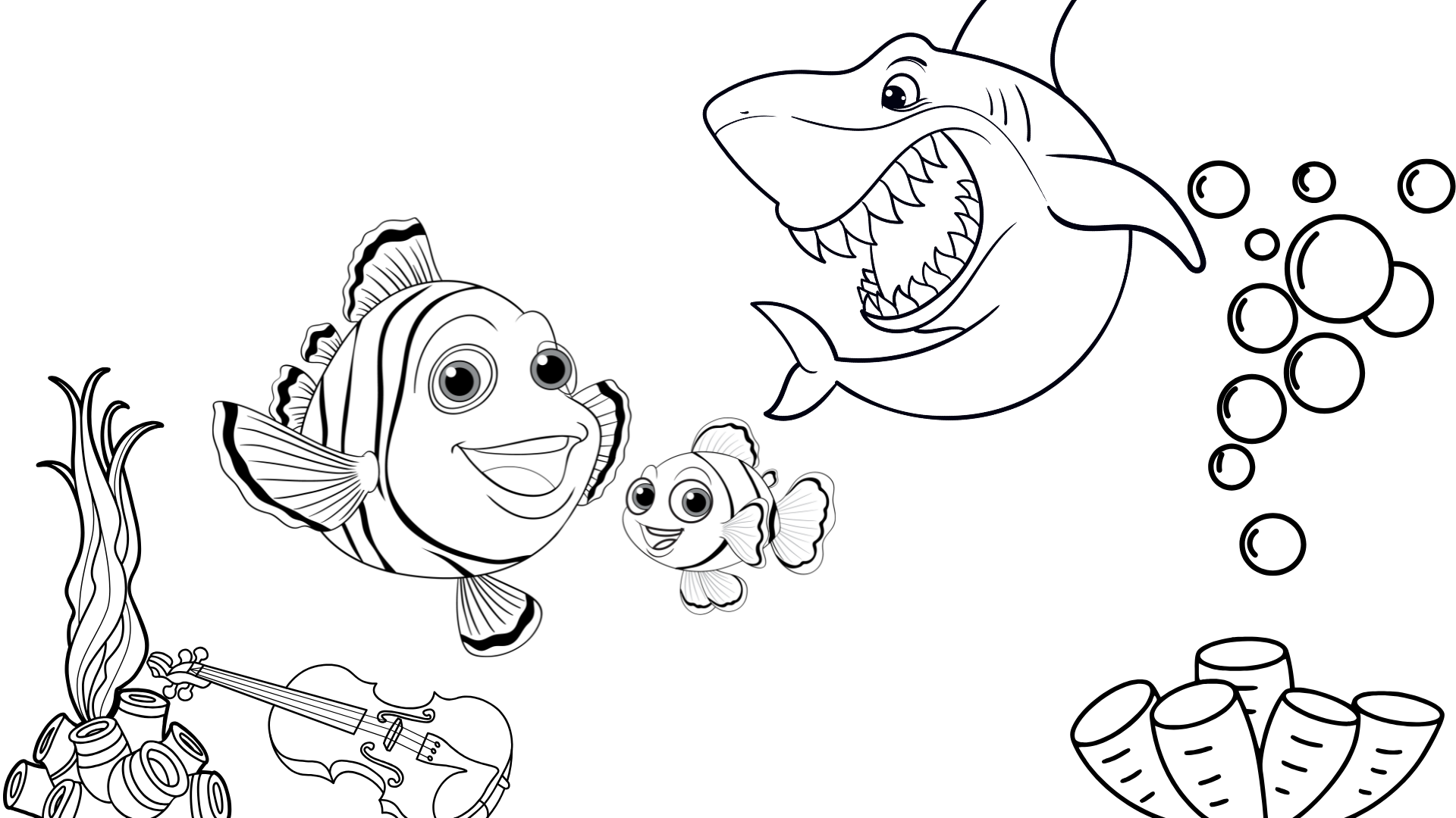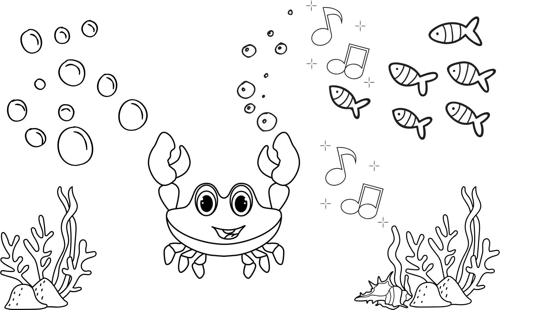 See the crab waving his claws as he leads fish musicians? Color each sea creature a different shade for a rainbow effect!