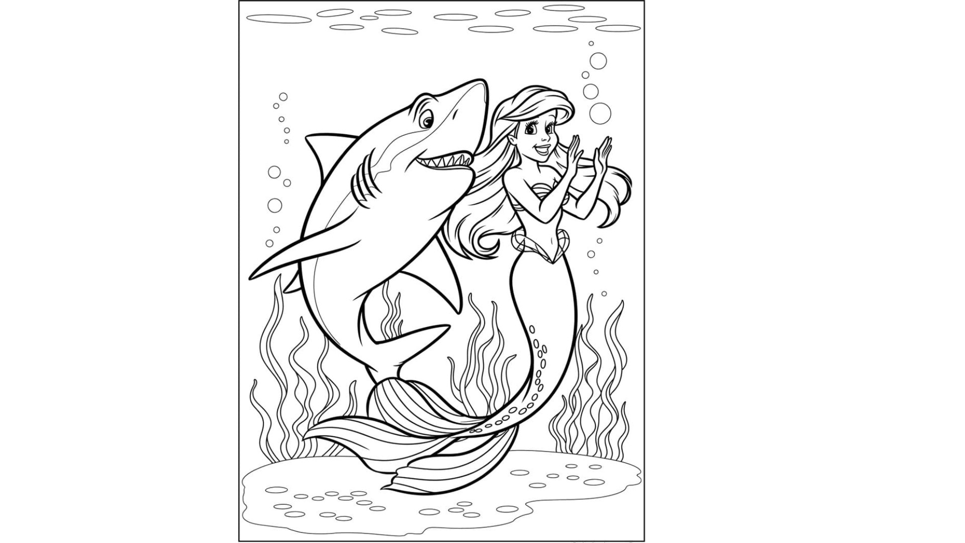 Shows a not-so-scary shark meeting Ariel. Will you color the shark gray, blue, or maybe a surprise color?