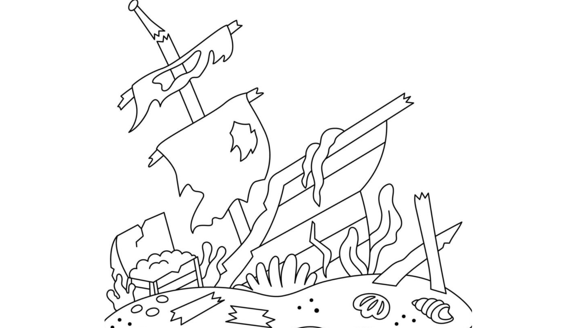 Shows an almost wrecked and sunken ship. Look for hidden items as you color this page full of secrets!