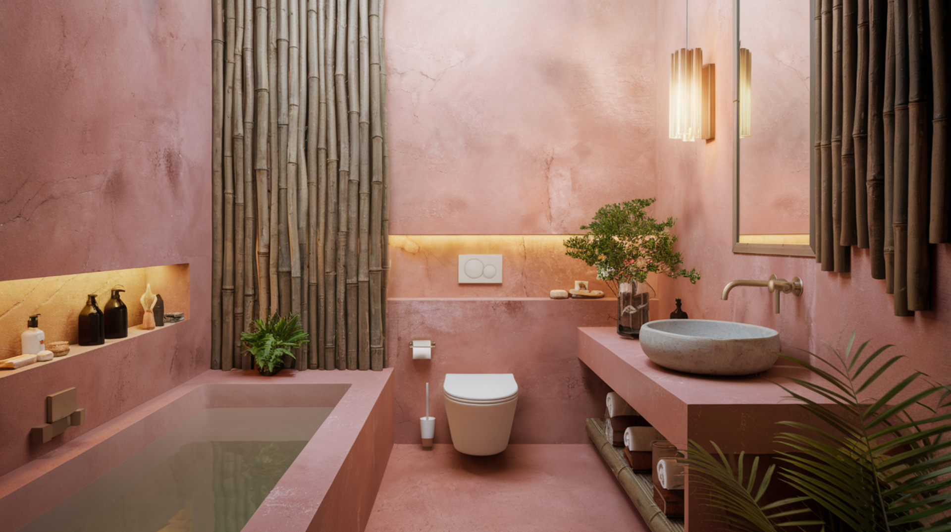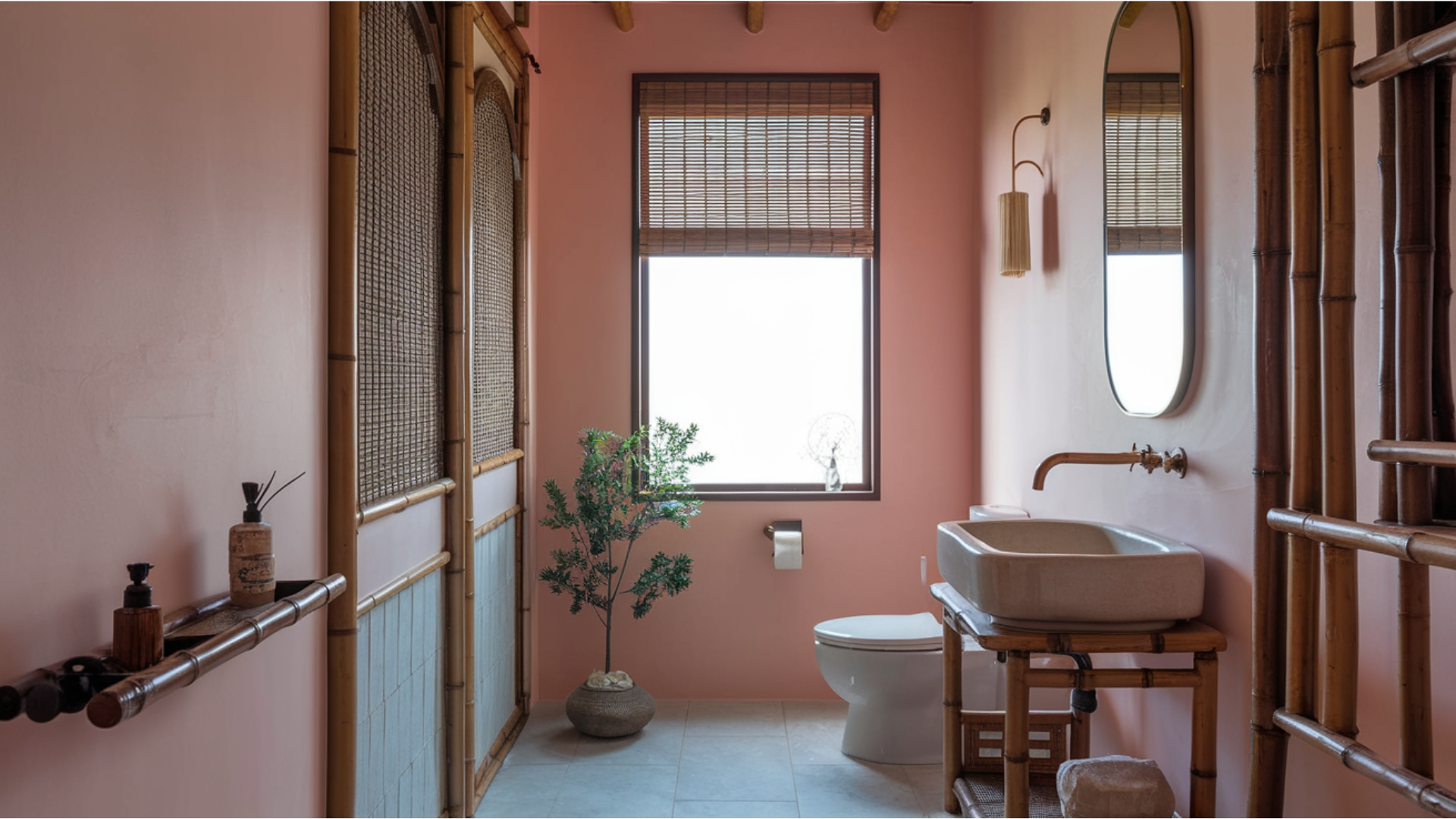 Soft pinks combined with elements like bamboo, porcelain, and calligraphy create a calm, serene atmosphere in an Asian-inspired bathroom.