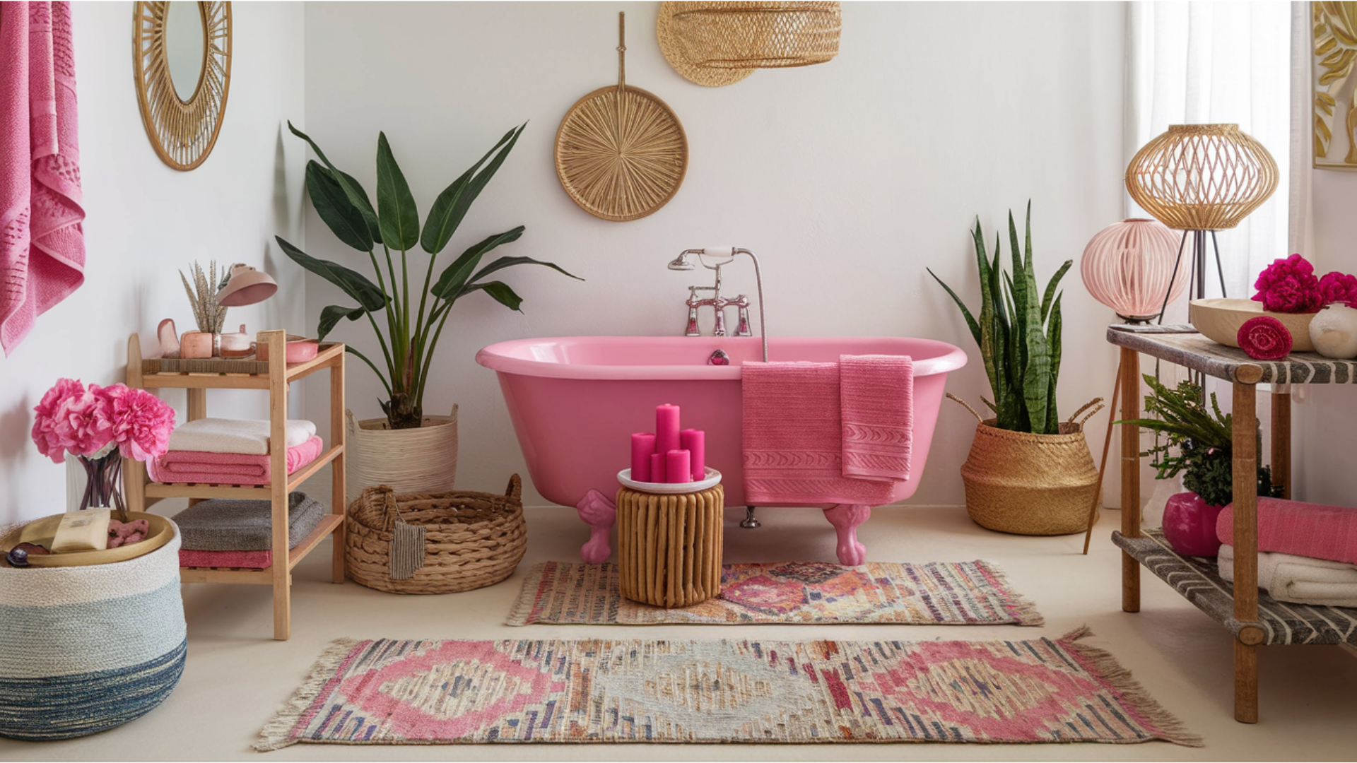 Bohemian bathrooms thrive on mixing colors, textures, and patterns, and pink fits perfectly in this laid-back style. Rich pink tones blend beautifully with boho-inspired woven rugs, eclectic art, and natural wood accents.