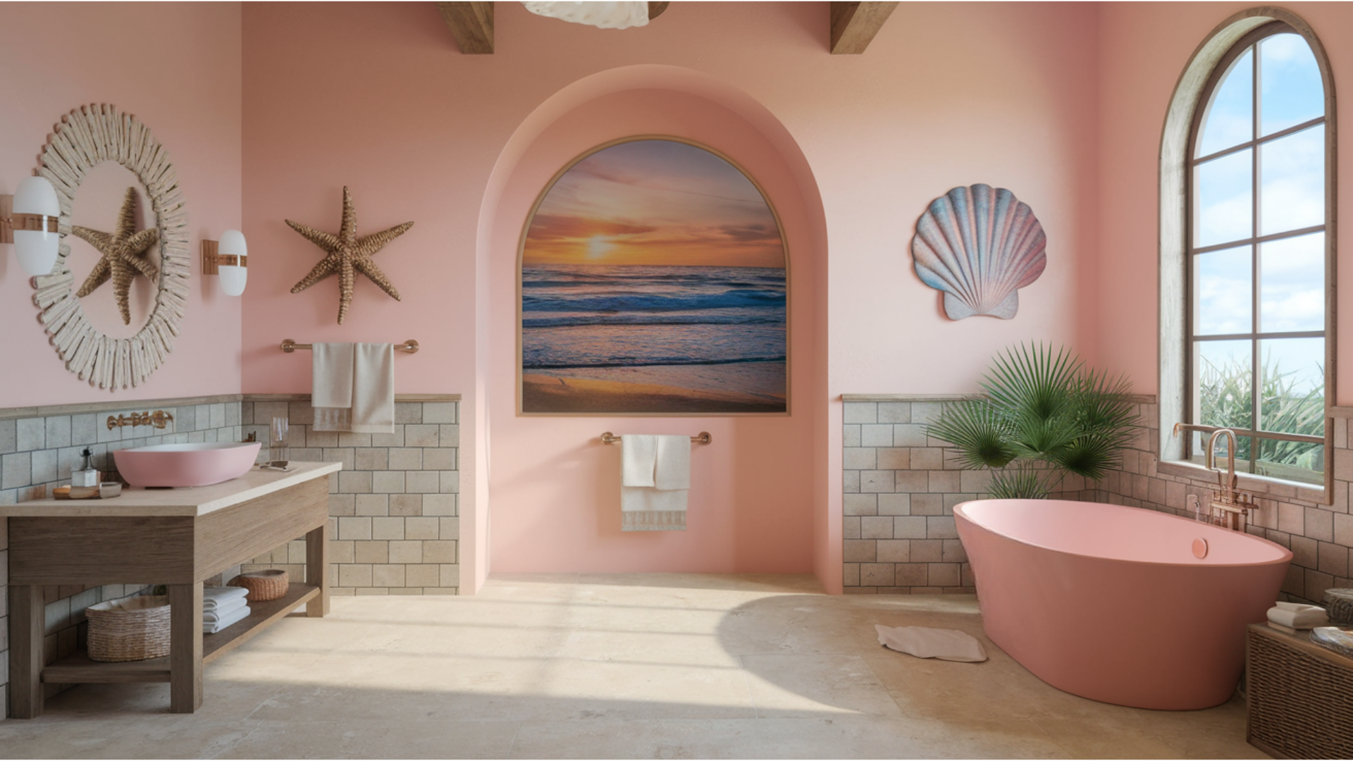 Light pinks, like blush or coral, create a serene and breezy coastal atmosphere in the bathroom. Paired with white or sandy hues and natural textures, these shades evoke the feel of the beach.