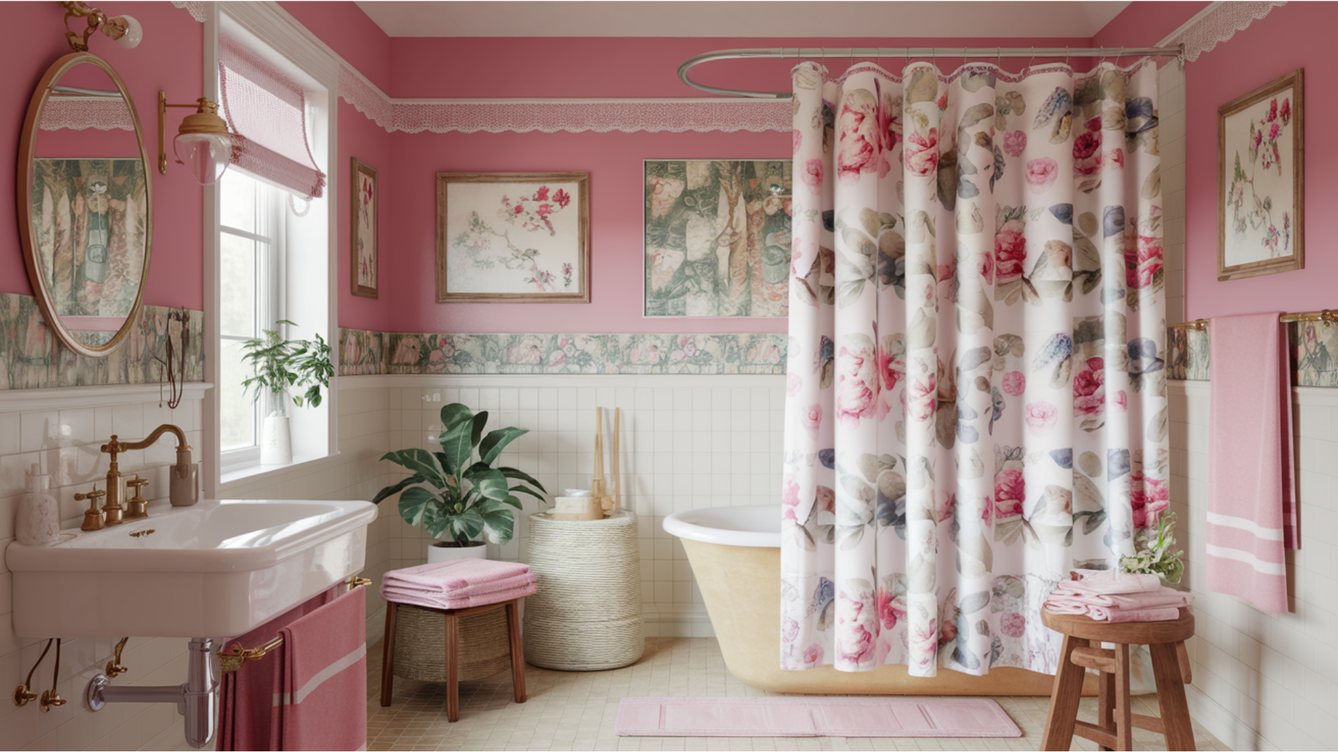 Soft, vintage-inspired pinks blend wonderfully with floral patterns, lace, and cozy furniture in a cottage-style bathroom. Use light pink on the walls, towels, or bedding to create a welcoming, homely vibe.