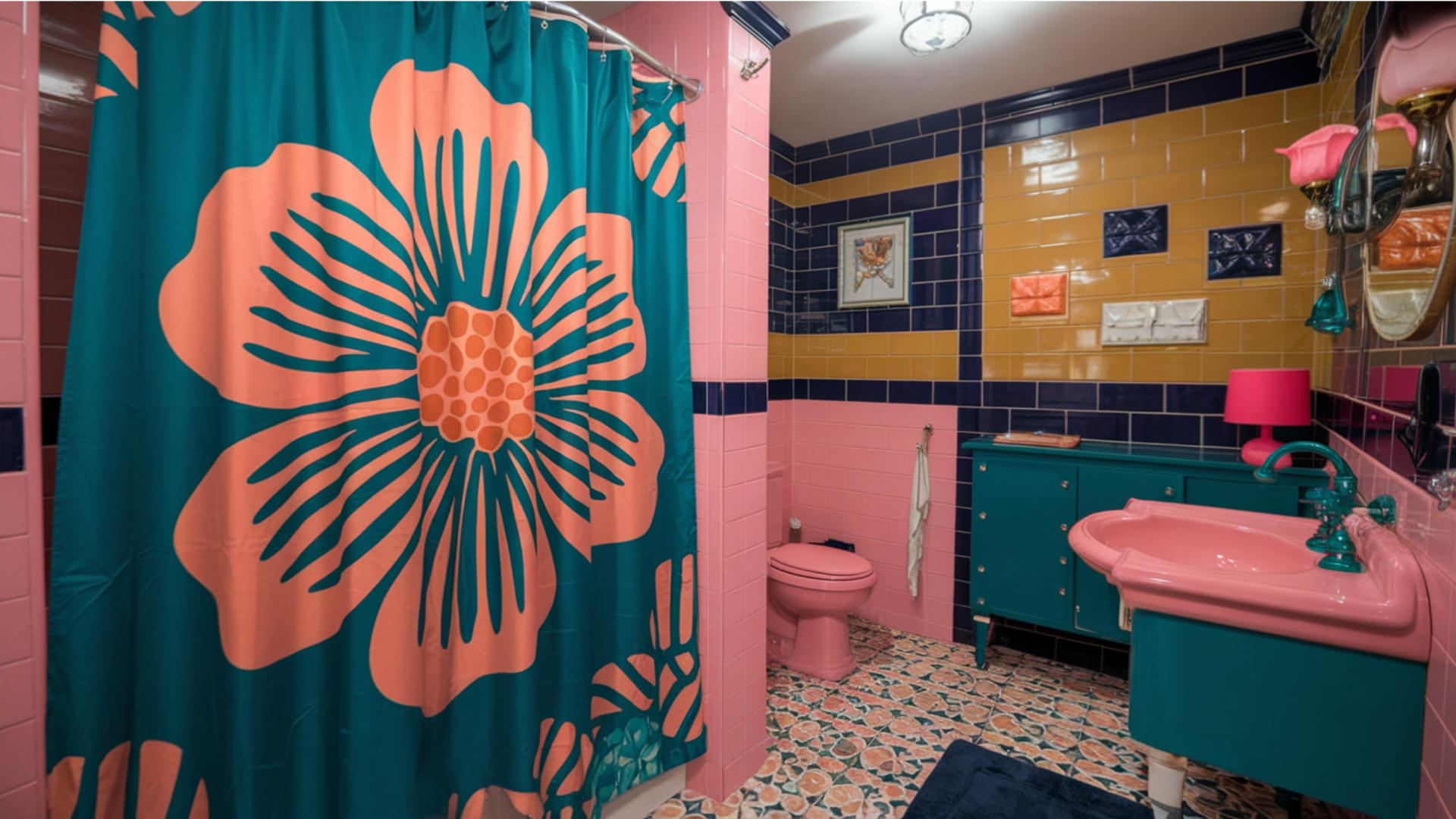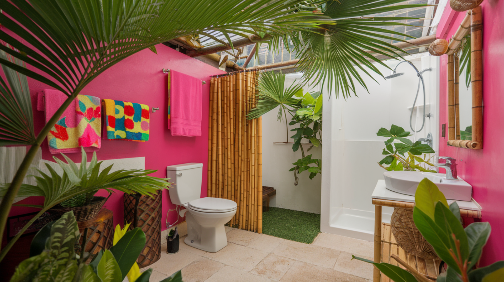 Bright pinks mixed with vibrant greens create a lively tropical feel, perfect for a bathroom inspired by the tropics.
