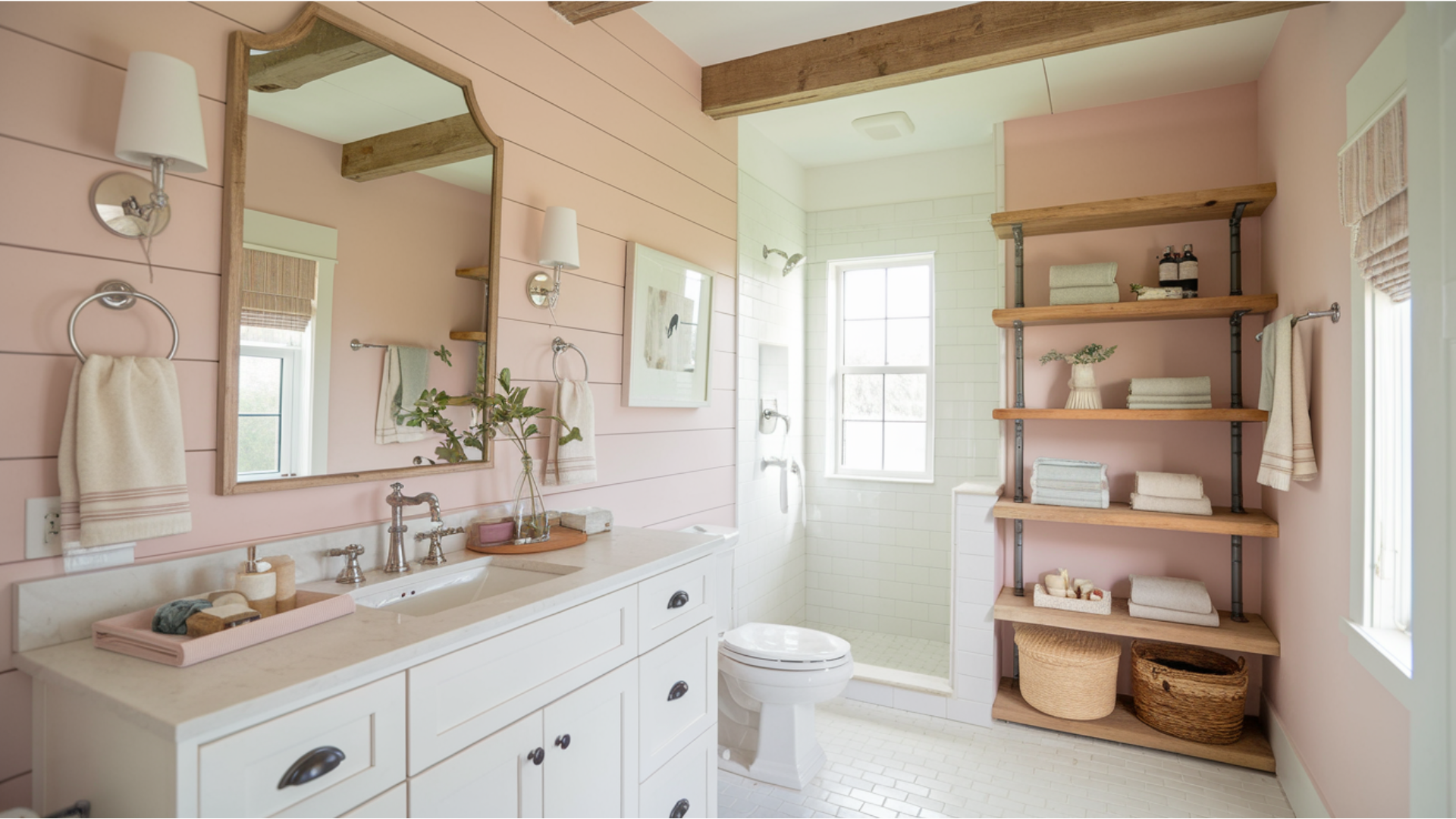 Soft pink tones complement rustic wooden accents in a farmhouse bathroom, creating a warm and inviting atmosphere. Combine pink walls with shiplap, natural wood vanities, and simple fixtures for a cozy, homey vibe.