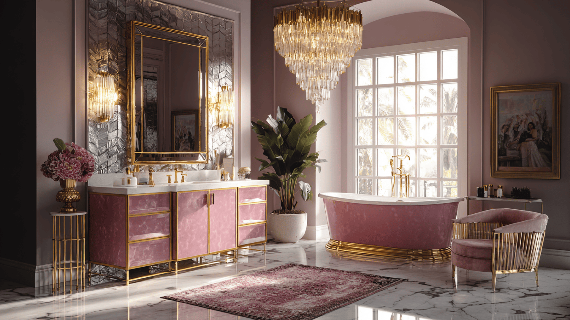 A Hollywood glam bathroom exudes luxury with bold pink tones, shiny gold accents, and silver details. Think lavish chandeliers, mirrored surfaces, and sleek, glamorous fixtures.