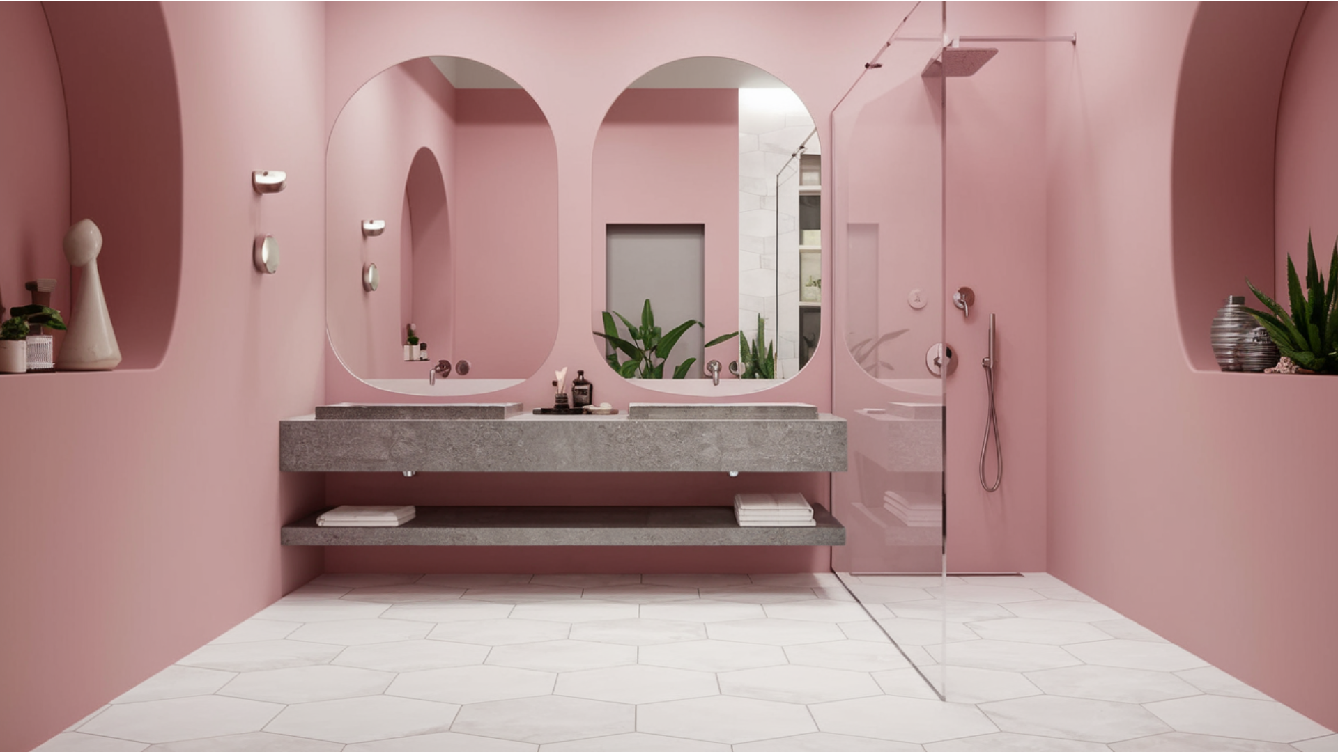 In a contemporary bathroom, soft pinks balance cool, modern tones like steel and glass. Use pink accents like towels, vases, or artwork to bring a subtle pop of color without overwhelming the minimalist design.