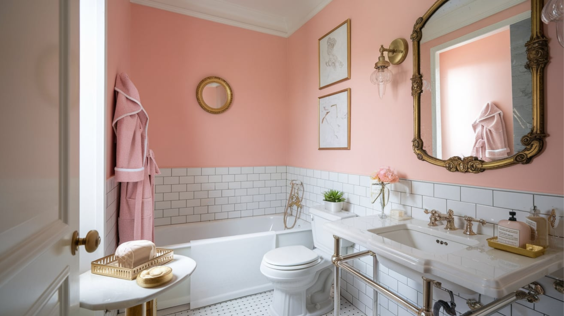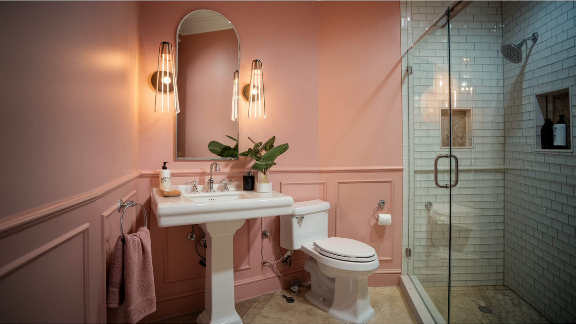 A transitional bathroom seamlessly blends modern elements with traditional touches, and pink works well to balance these styles. Soft blush-pink walls paired with classic fixtures create a welcoming atmosphere.