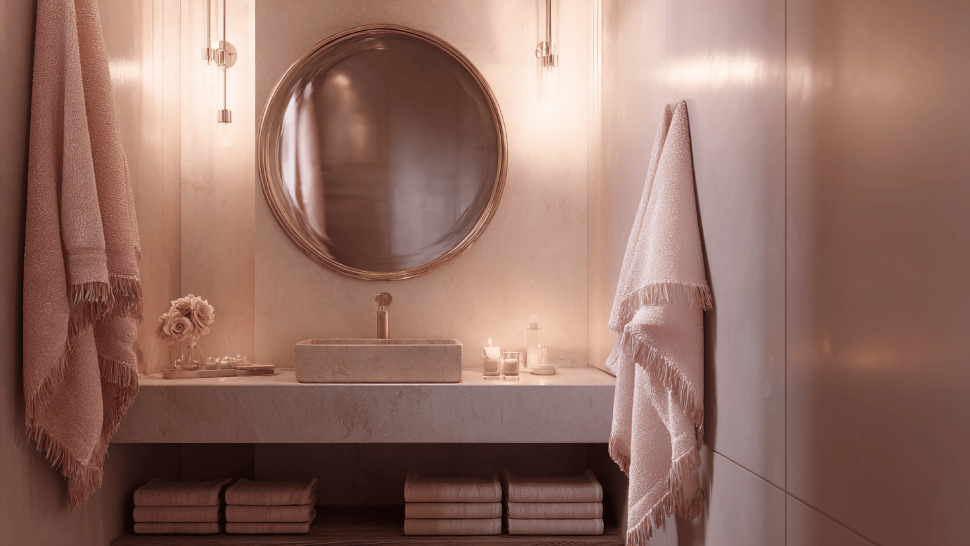 A romantic bathroom in soft pink tones features vintage mirrors, delicate light fixtures, and luxurious towels. Use floral patterns, satin finishes, and warm lighting to enhance the intimate, dreamy atmosphere.