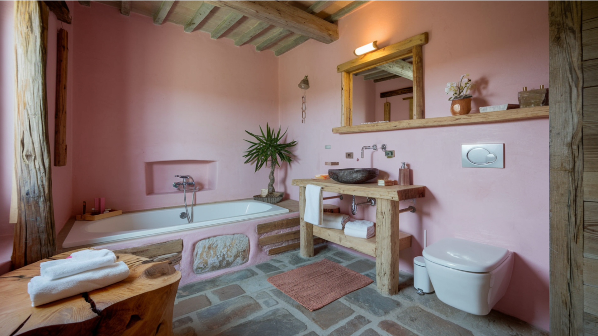 Rustic bathrooms featuring pink tones bring a soft, inviting touch to the rough textures of wood and natural stone.