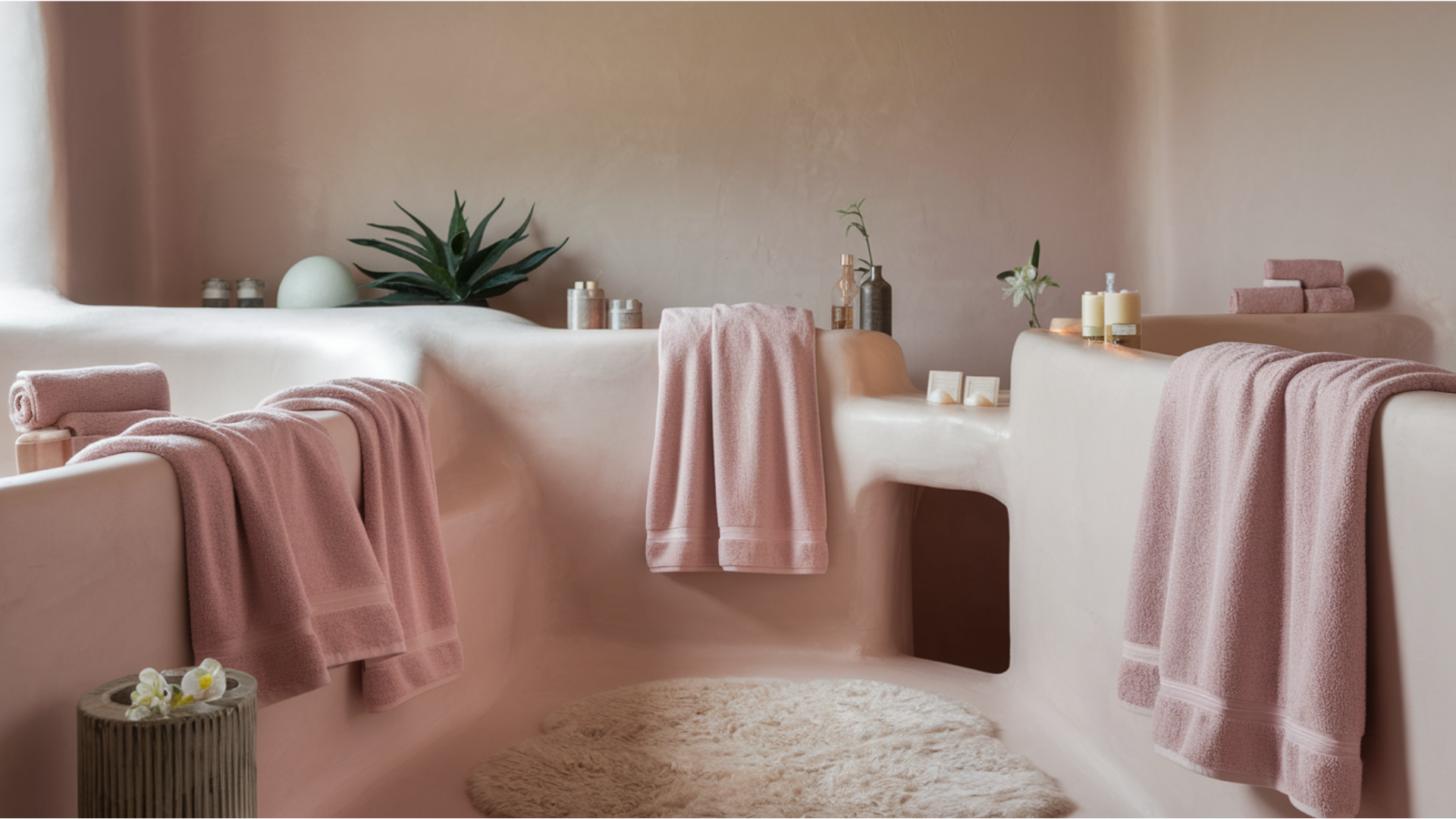 Light to dark hues of pink on the walls, tiles, towels, and accessories work together for a cohesive look.