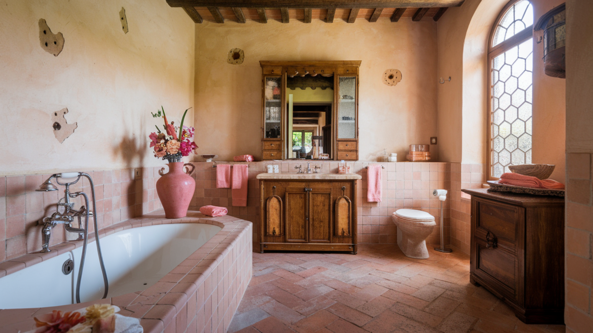 Tuscany-inspired bathrooms bring warmth and rustic charm, and soft pinks complement terracotta tiles and wooden accents beautifully. Pair pink with earthy tones, such as browns and beiges, to create a Mediterranean feel.