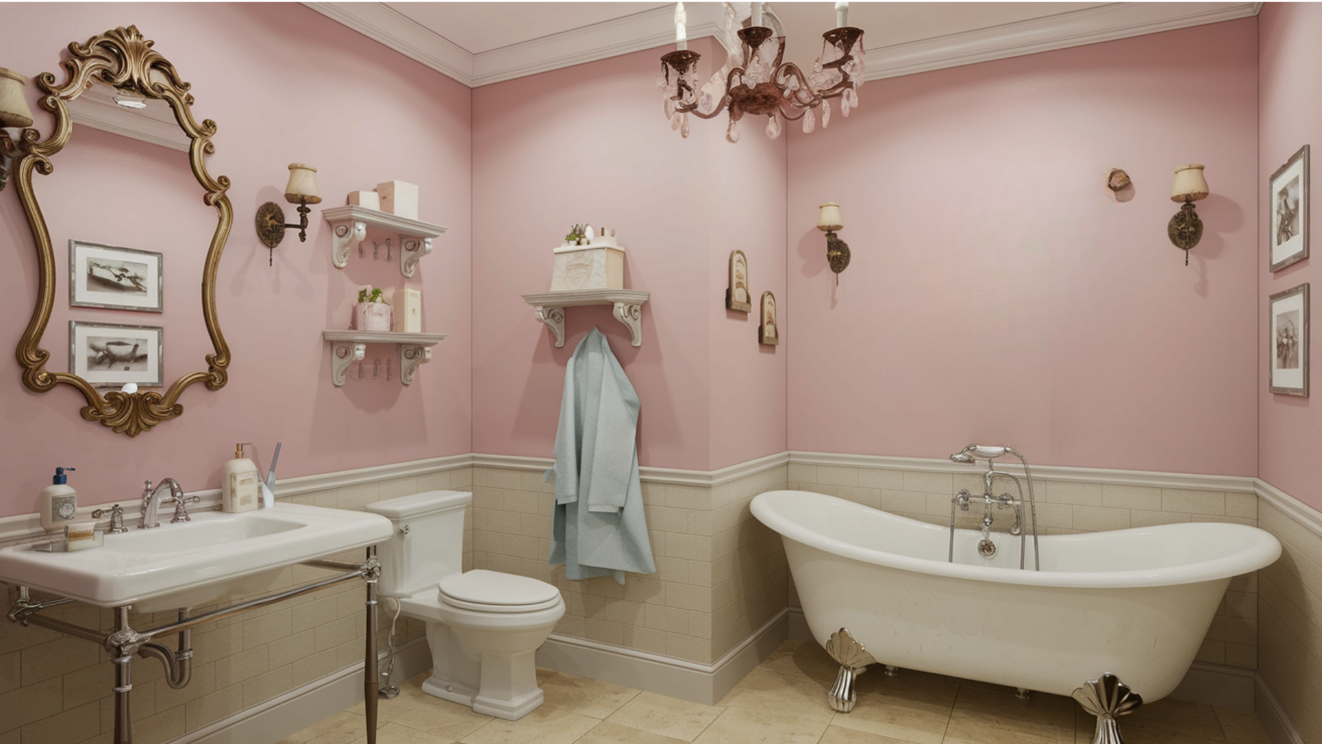 Pastel pinks paired with antique-style fixtures create an elegant, Victorian-inspired bathroom. Vintage bathtubs with claw feet, ornate mirrors, and chandeliers contribute to the classic look.