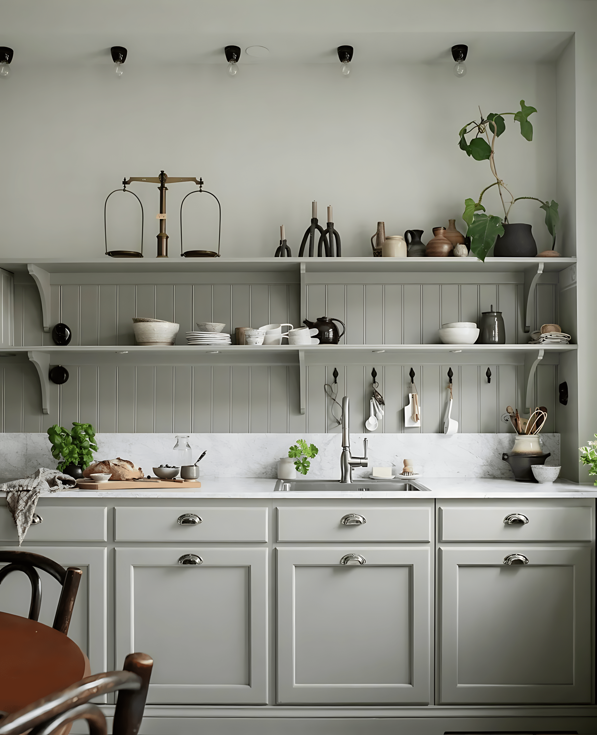 This combination enhances the room’s brightness and adds a subtle texture to the walls. The classic design elements and muted color palette create a timeless look, making it perfect for traditional and modern kitchens seeking a clean and cohesive look.