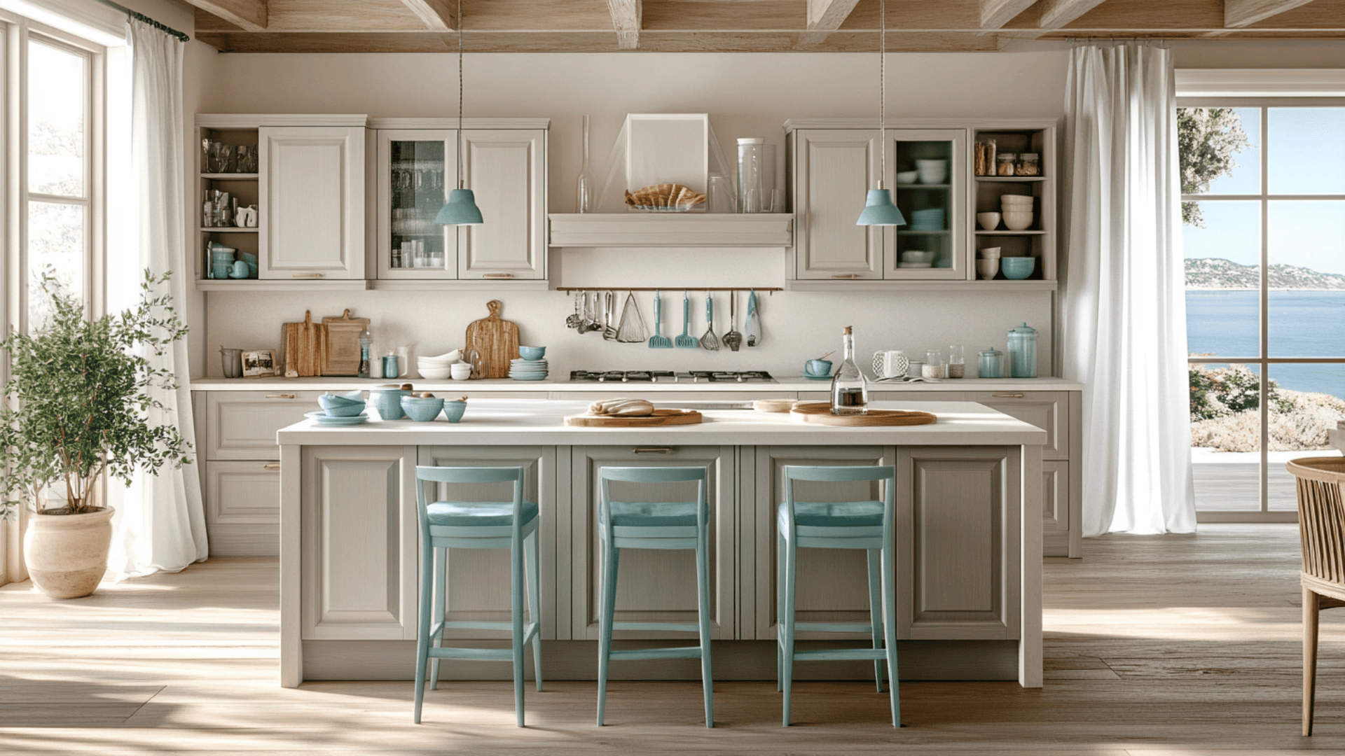 Pairing greige with ocean blues creates a beach house feel even miles from shore. Use blue in island seating, window treatments, or dishes for a fresh look.