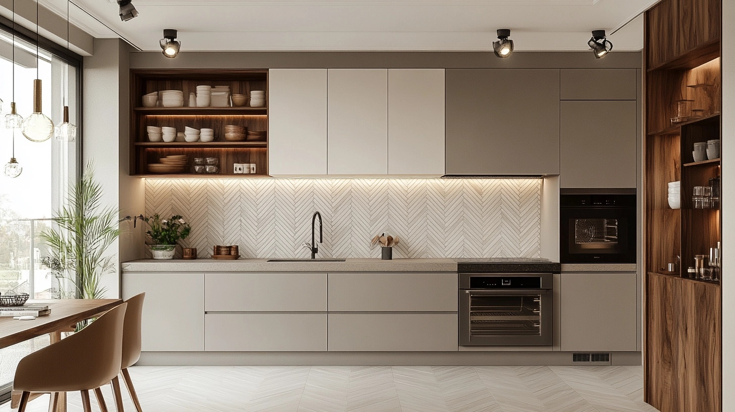 This approach gives you the warmth of greige without the closing-in effect that darker colors can create in small spaces, letting you enjoy the trend even in compact kitchens.