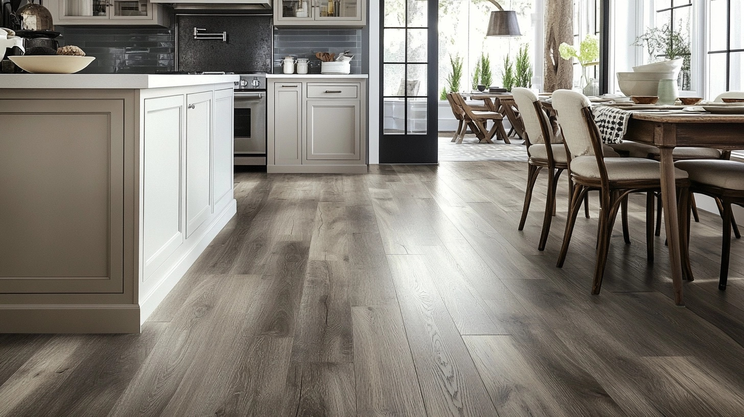 This pairing creates a grounded, rich feel with strong contrast. The dark floors make greige cabinets appear lighter, while the cabinets soften the impact of deep wood tones.