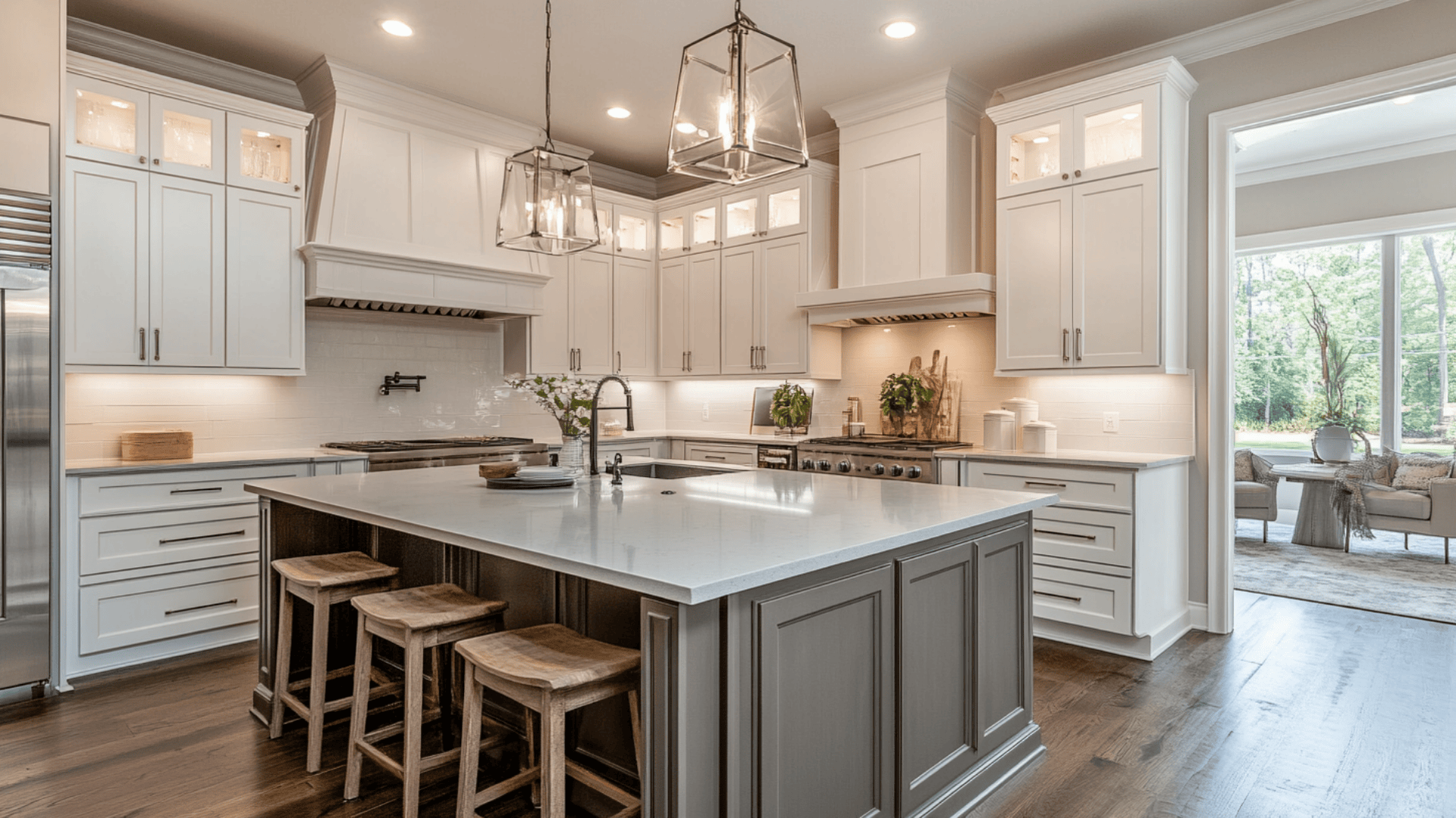 This approach lets you bring in the greige trend in a limited way. The contrast creates visual flow, guiding the eye toward the center of the kitchen where family and guests often gather.