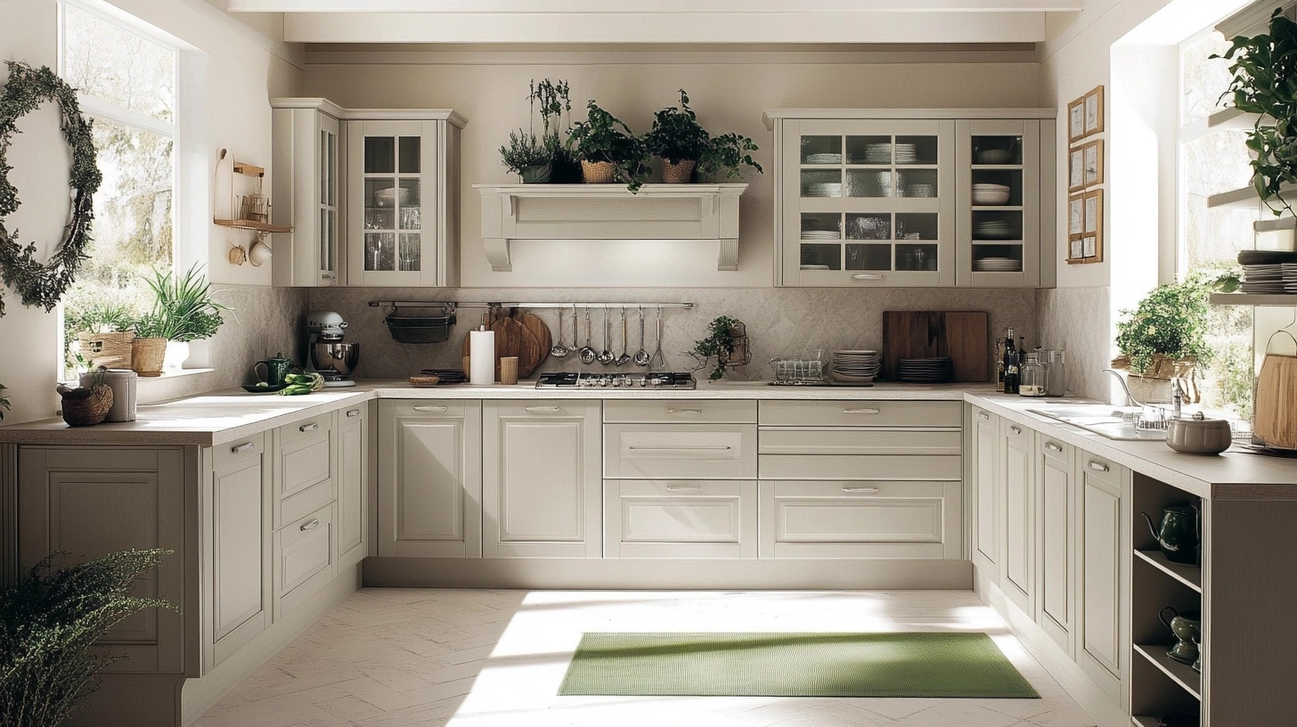 Plants, green glass, or sage accents bring life to greige kitchens. The neutral background lets these natural pops of color stand out without clashing.