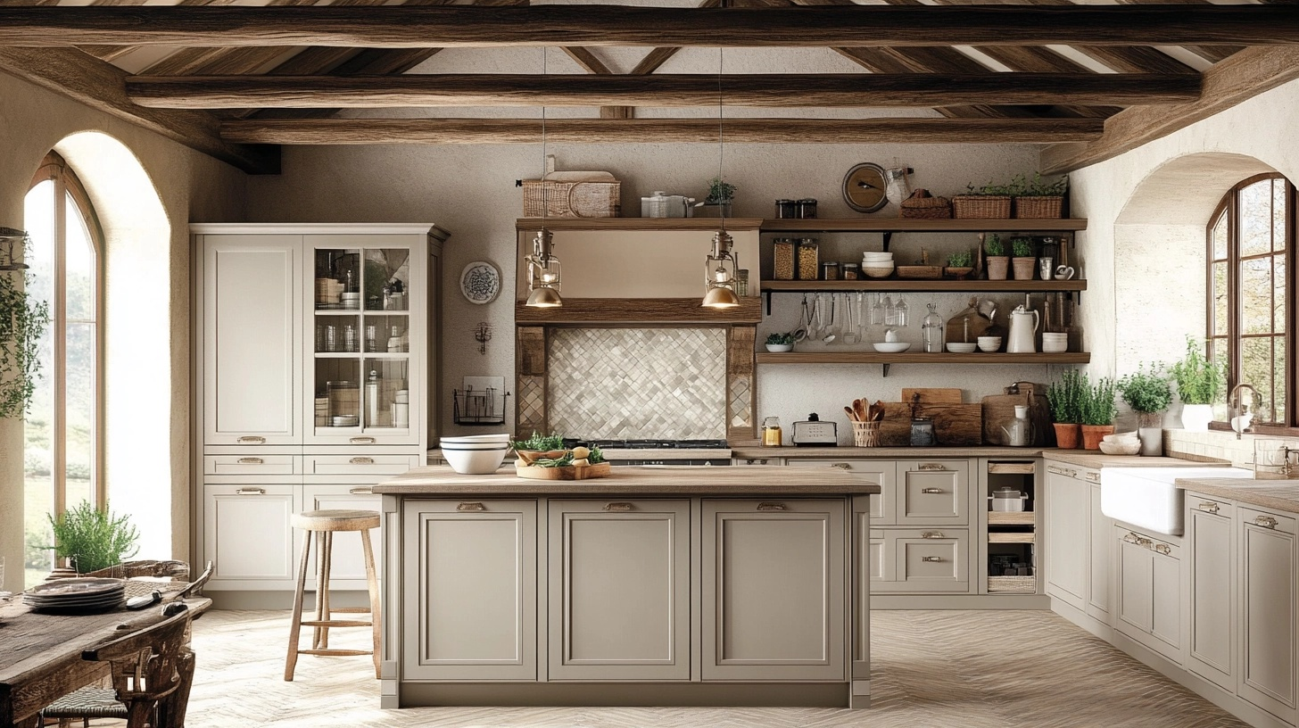 This style works especially well in older homes or new builds that want a classic look. The beams add height and character, while the greige cabinets provide a clean, updated base.