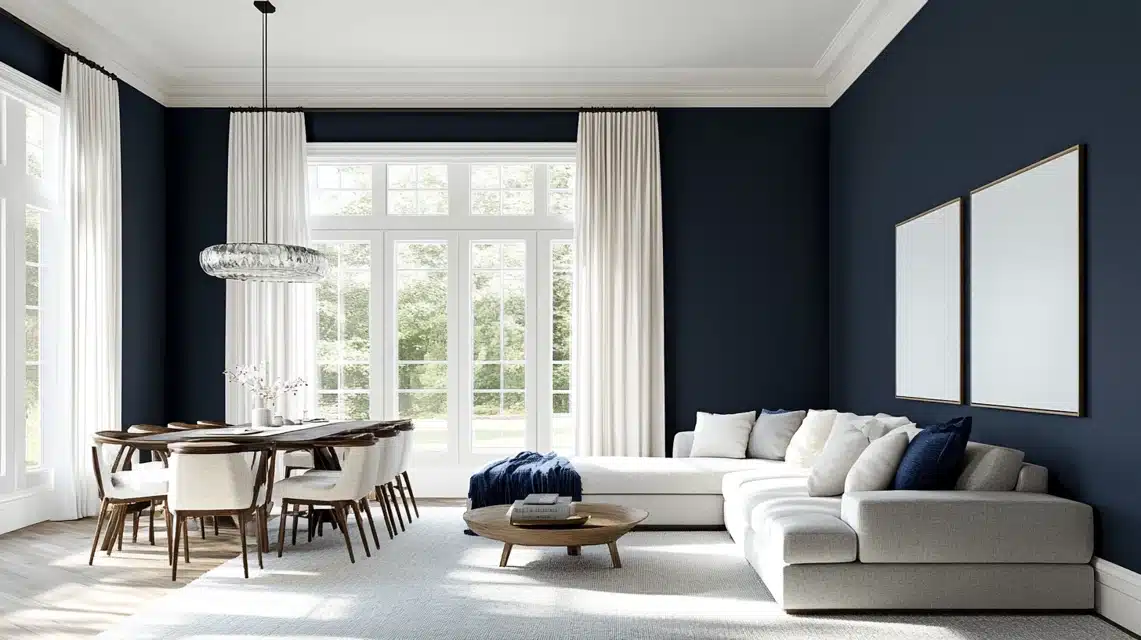 In my living room, I paired Hale Navy walls with Benjamin Moore’s Chantilly Lace on the trim and ceiling, and the contrast is absolutely stunning. The crisp white makes the navy feel even richer while keeping the space feeling fresh and bright.