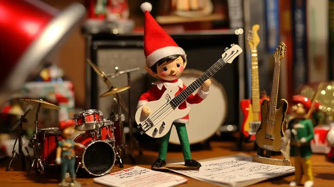 The elf conducts a band of action figures playing spoon guitars and paper plate drums.