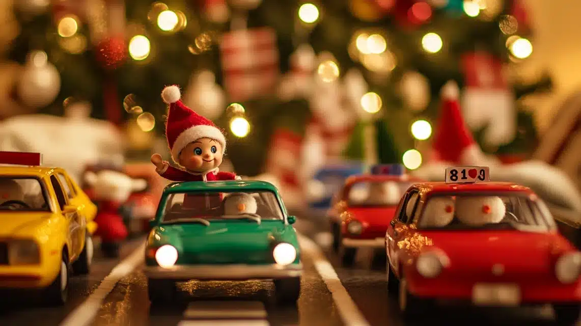 Our mischievous elf takes the driver’s seat in the lead car, wearing a tiny paper driver’s cap.