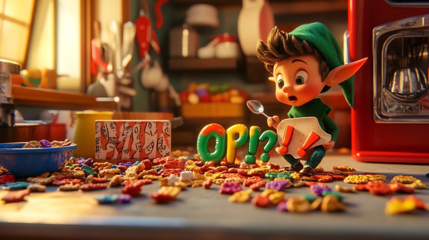 - Create a breakfast prep scene with tiny bowls and measuring cups scattered around, showing the elf’s failed attempt at making their breakfast.