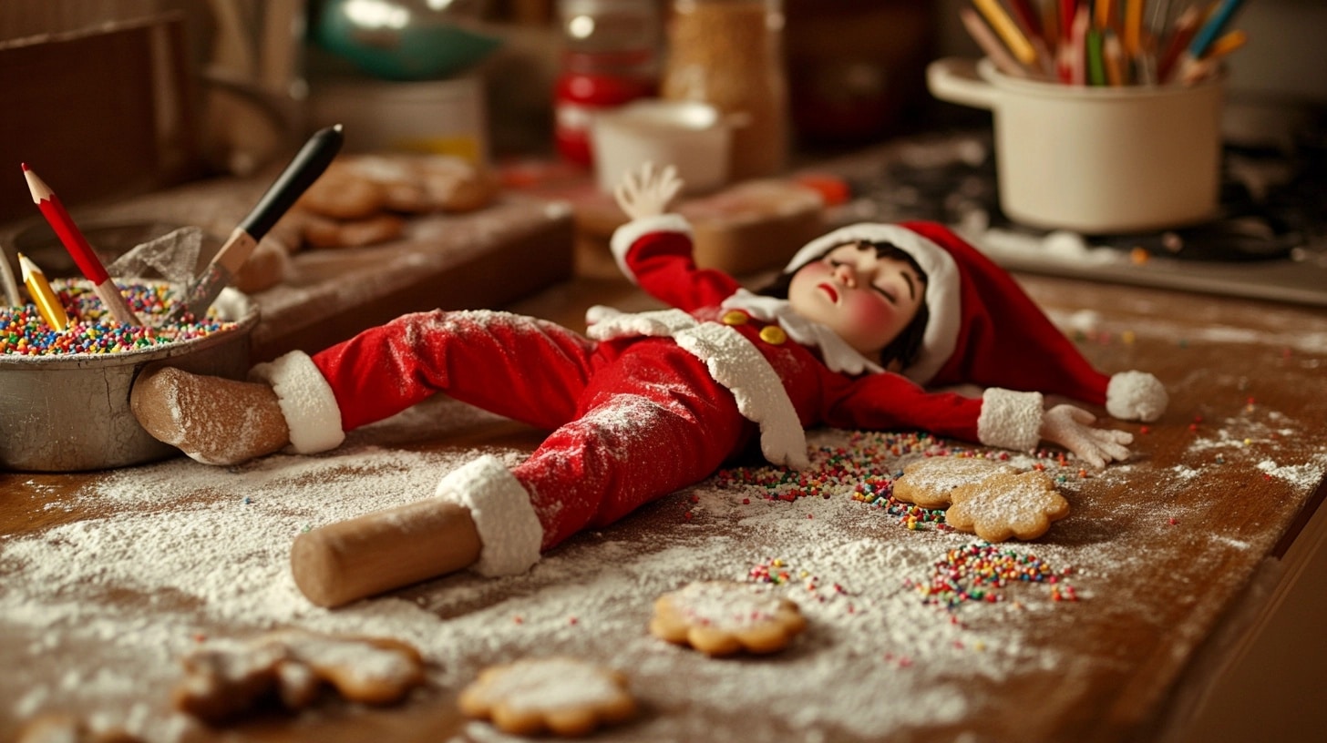 The elf lies exhausted among scattered sprinkles and miniature rolling pins made from pencils.